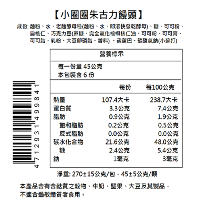 過敏原:本產品含有含麩質之穀物、牛奶、堅果、大豆及其製品、不適合過敏體質者食用。