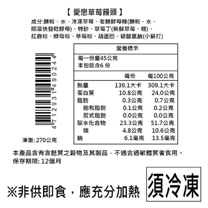 成分:麵粉、水、冷凍草莓、老麵酵母種(麵粉、水、即溶快發乾酵母)、特砂、草莓丁(新鮮草莓、糖)、紅麴粉、酵母粉、草莓粉、葫蘆巴、碳酸氫鈉(小蘇打)