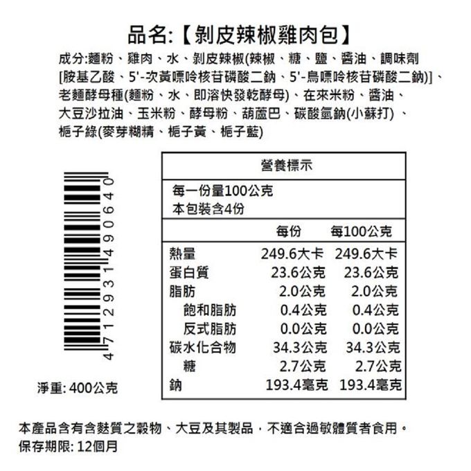 成分:麵粉、雞肉、水、剝皮辣椒(辣椒、糖、鹽、醬油、調味劑[胺基乙酸、5'-次黃嘌呤核苷磷酸二鈉、5'-鳥嘌呤核苷磷酸二鈉)]、老麵酵母種(麵粉、水、即溶快發乾酵母)、在來米粉、醬油、大豆沙拉油、玉米粉、酵母粉、葫蘆巴、碳酸氫鈉(小蘇打) 、梔子綠(麥芽糊精、梔子黃、梔子藍)