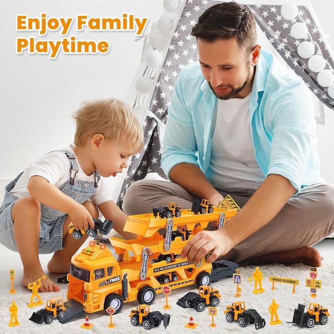 兒童聲光卡車三層工程運輸車套裝玩具21件組