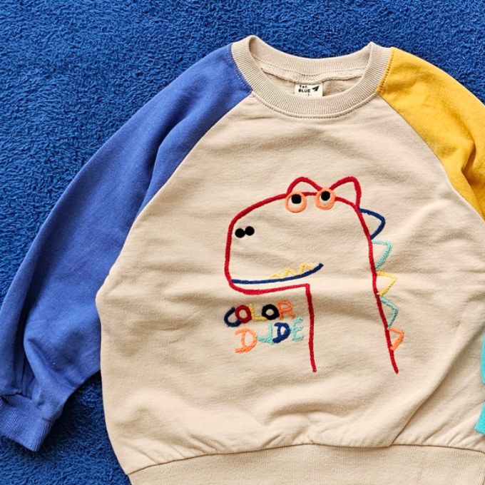 韓國 First Blue - 色線恐龍撞色長袖大學T