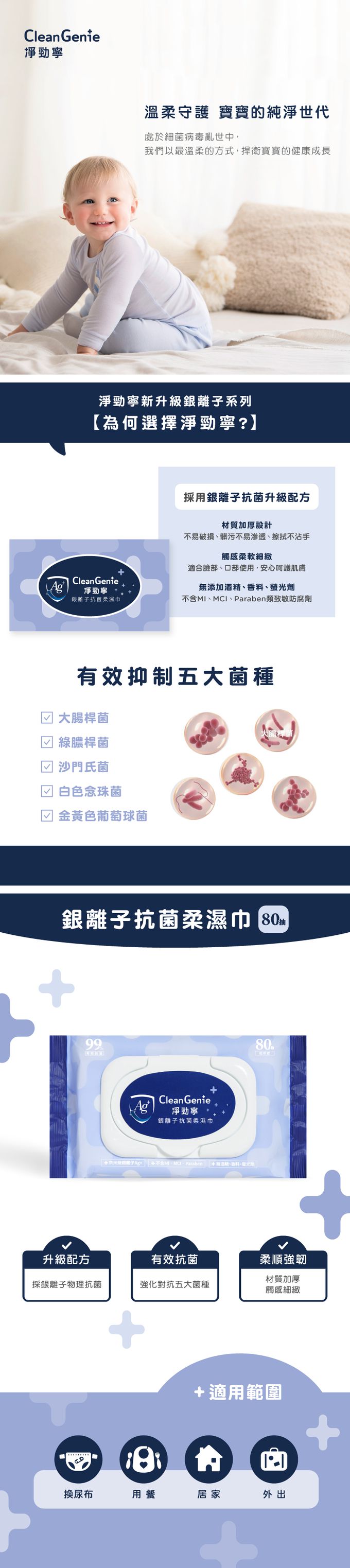 ● 採用銀離子抗菌升級配方。● 有效對抗金黃色葡萄球菌、大腸桿菌、綠膿桿菌、白色念珠菌、沙門氏菌等5大菌種。● 材質加厚設計,不易破損、髒污不易滲透、擦拭不沾手。● 觸感柔軟細緻,適合臉部、口部使用。● 無添加酒精、香料、螢光劑,不含MI、 MCI、 Paraben類致敏防腐劑,安心呵護肌膚。