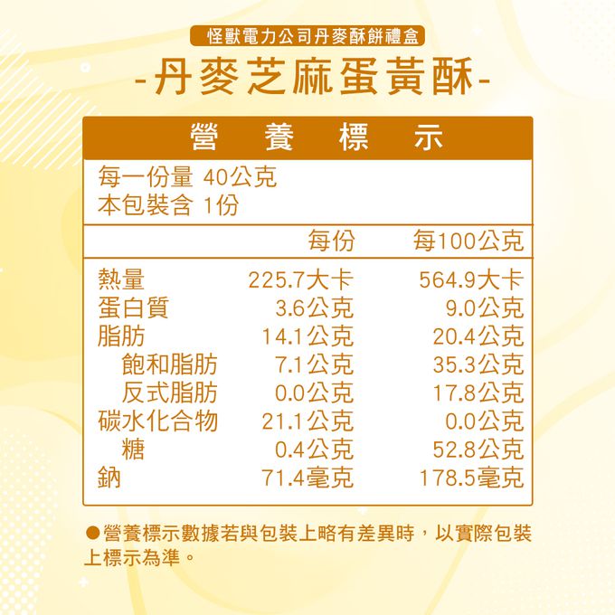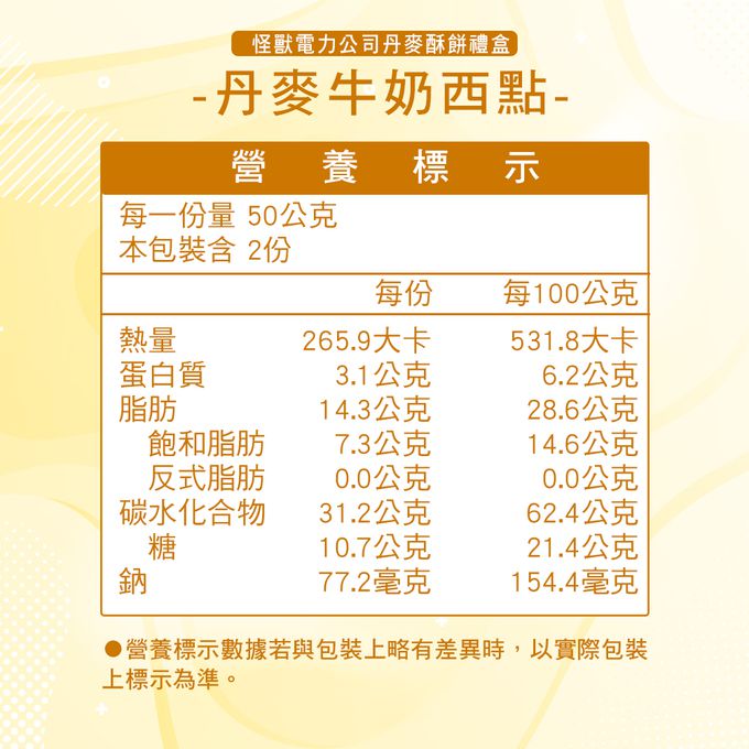 過敏原:丹麥牛奶西點、丹麥斯納普西點、丹麥牛奶餅:本產品含有麩質穀物、牛奶、蛋及其製品。 丹麥可可西點:本產品含有麩質穀物、蛋及其製品。 丹麥椰子酥:本產品含有麩質穀物、牛奶、蛋、堅果類及其製品。 丹麥芝麻蛋黃酥:本產品含有麩質穀物、牛奶、蛋、芝麻及其製品。
