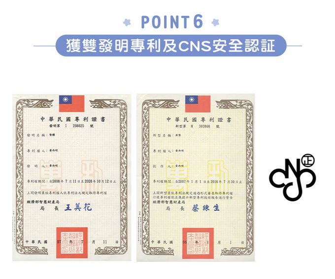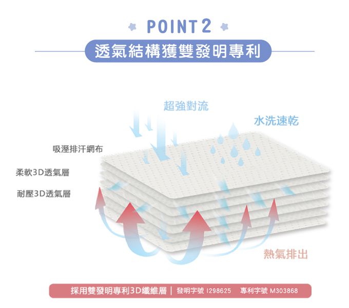 1.MIT製造,採用雙發明專利的3D立體纖維層;透氣散熱,吸震耐重發明字號I298625 / 專利字號M303868