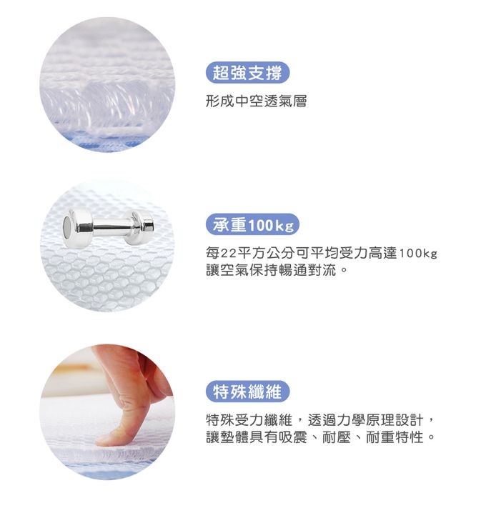 3.立體編織黃金比例7mm蜂巢網孔,吸震、耐壓、耐重,22cm²平均受力達100kg,讓空氣保持通暢對流