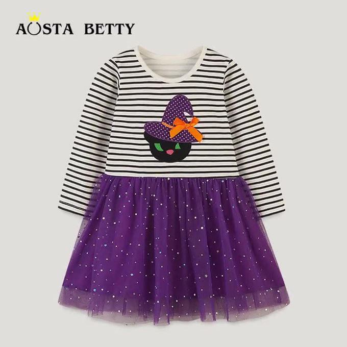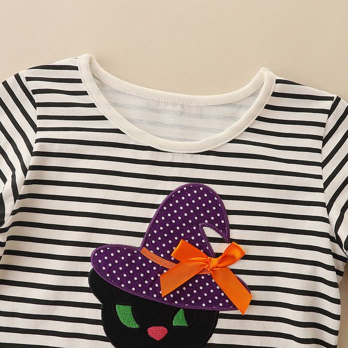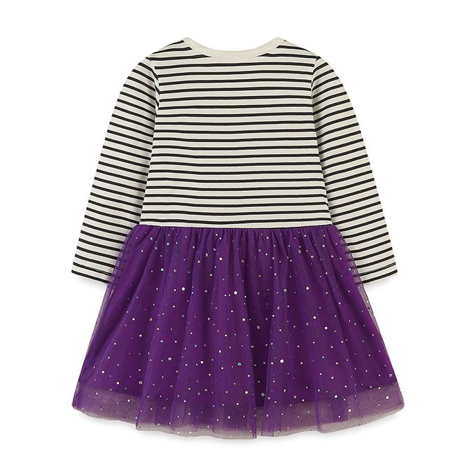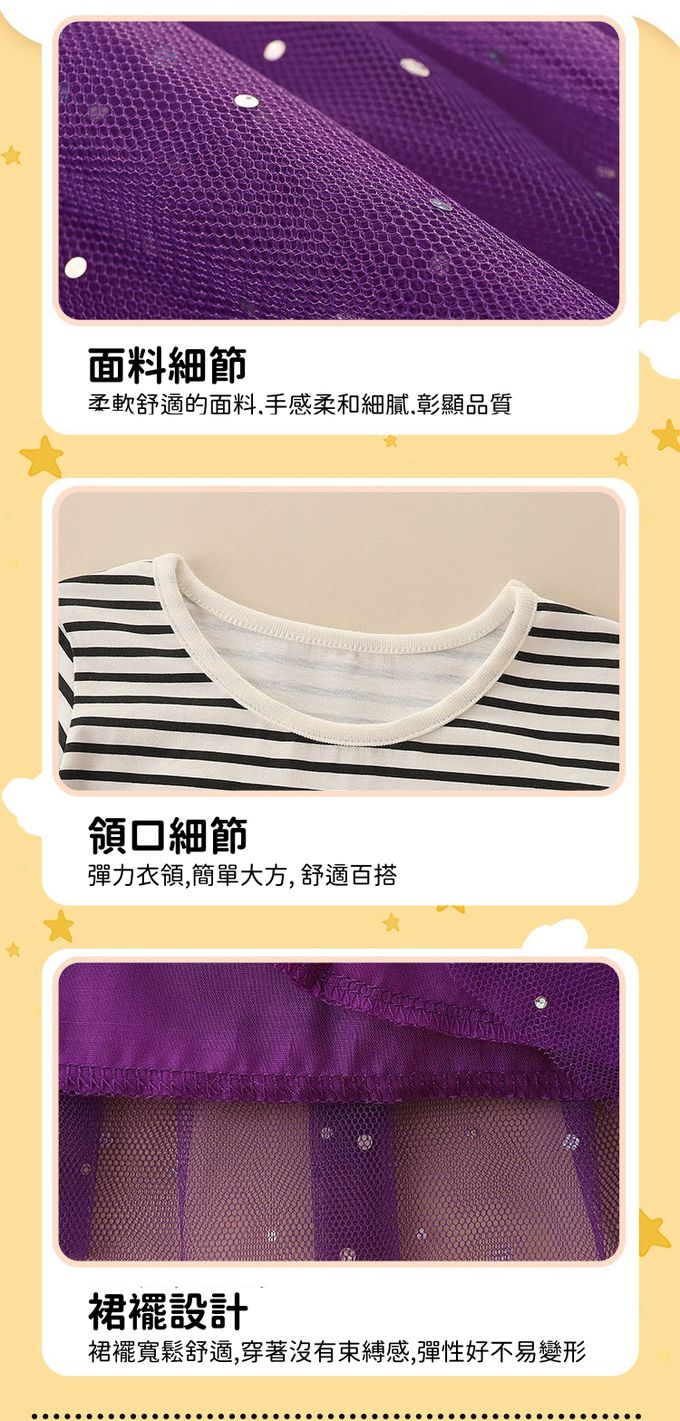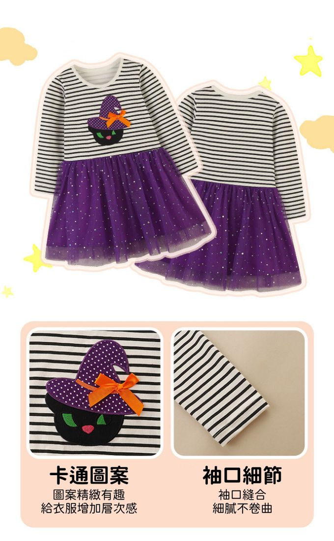 紫色再配上亮片網紗裙,胸前有可愛的巫婆帽設計,上衣是百搭耐看的黑白橫條紋,觸感則是棉質親膚不厚重~