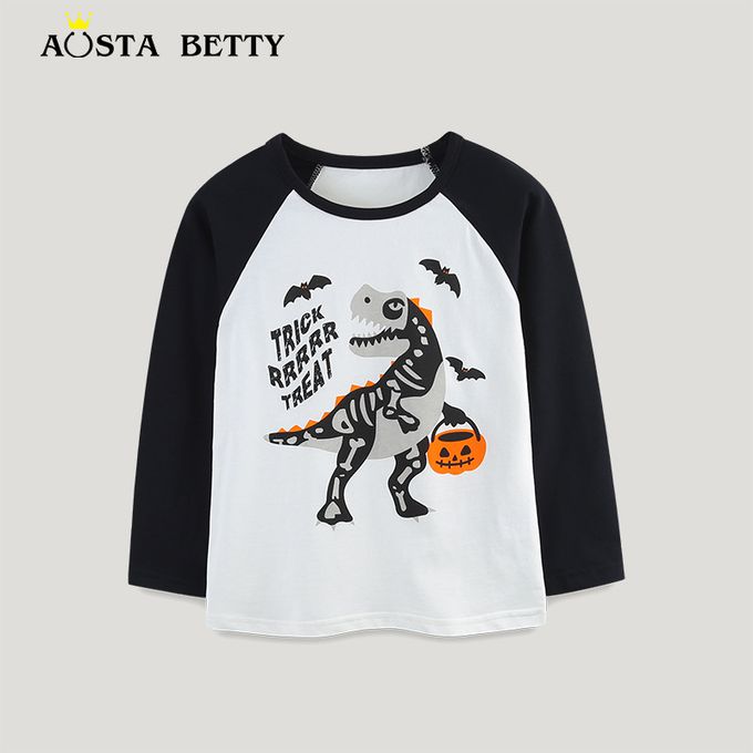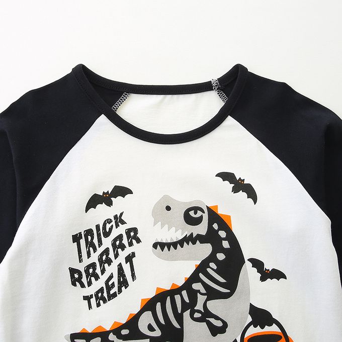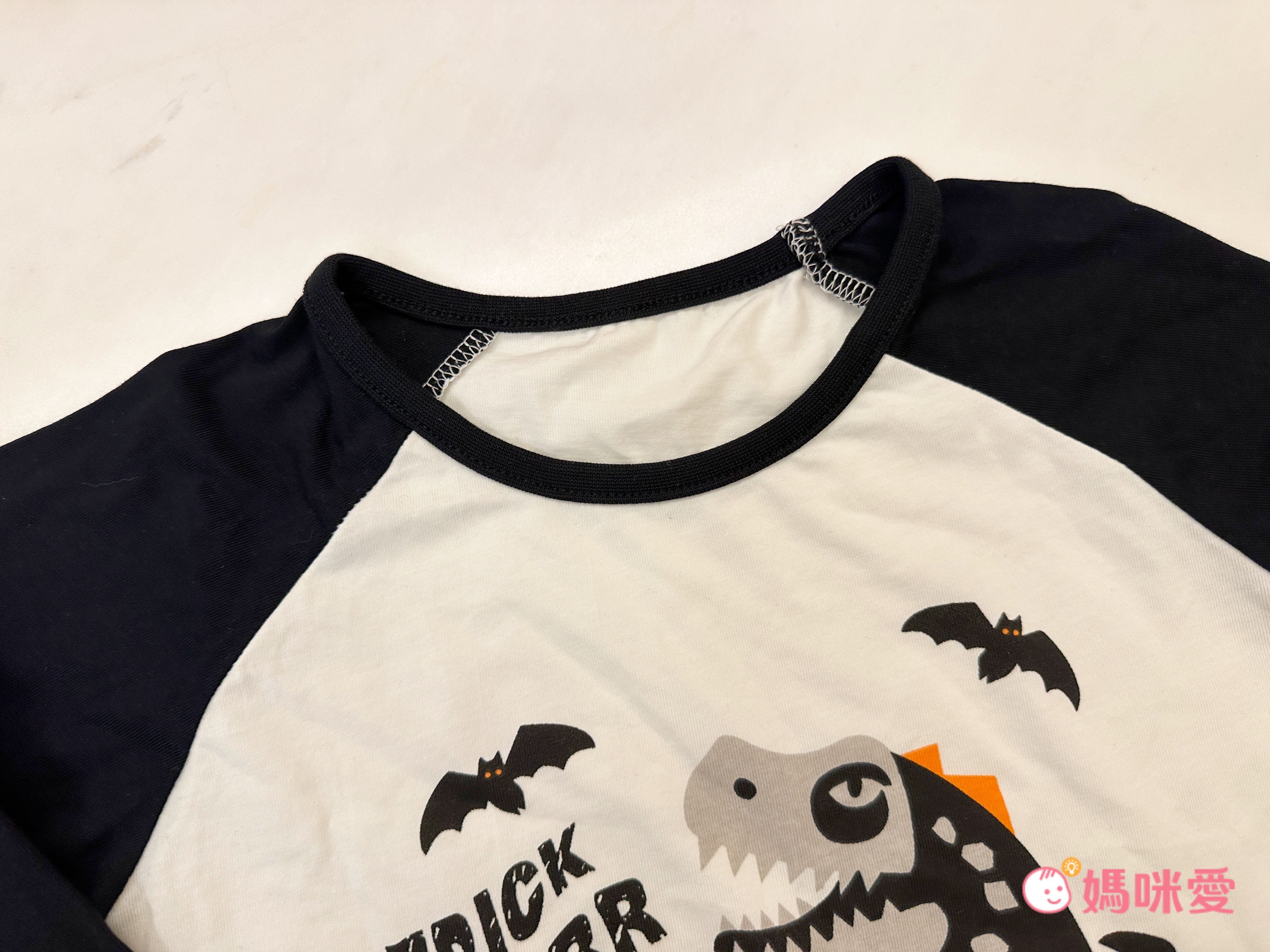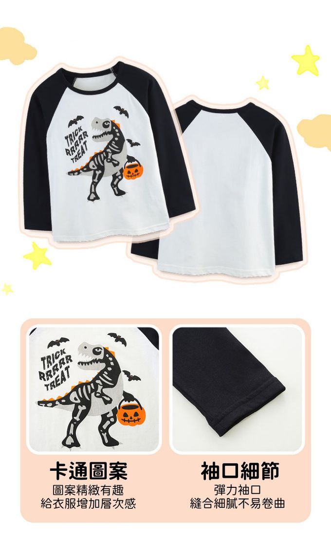 再來是第二件黑白撞色的南瓜恐龍長袖T-shirt,圖案是一隻恐龍提著南瓜燈籠,旁邊還有蝙蝠點綴,相當童趣。