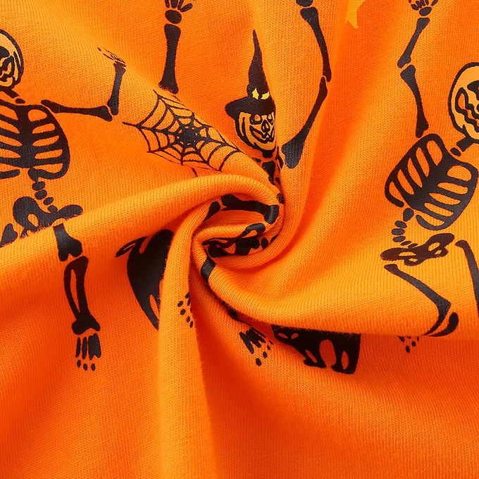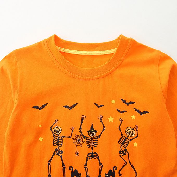 [萬聖節]純棉圓領長袖上衣/t恤-跳舞骷髏-橘色