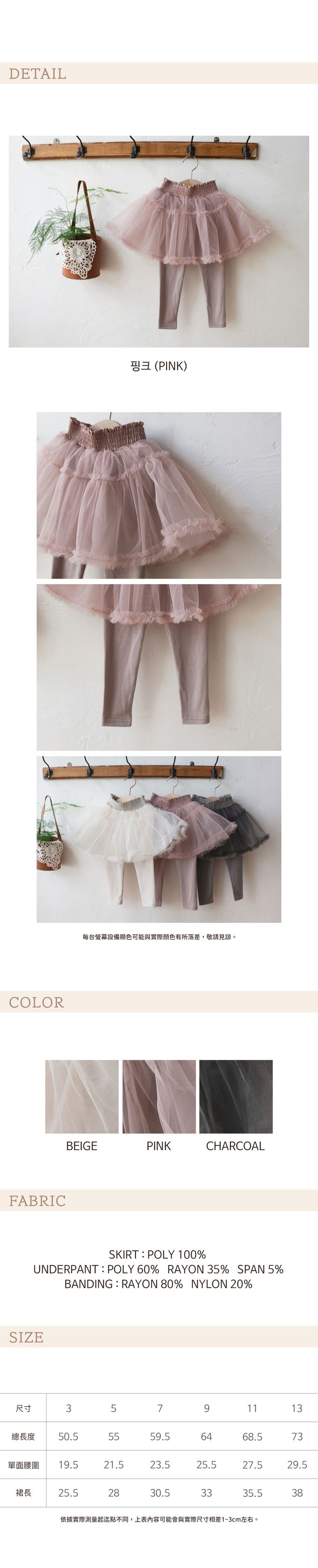 • 成分:裙子:100%聚酯纖維,內搭:60%聚酯纖維+35%嫘縈+5%彈性纖維,鬆緊腰:80%嫘縈+20%尼龍
