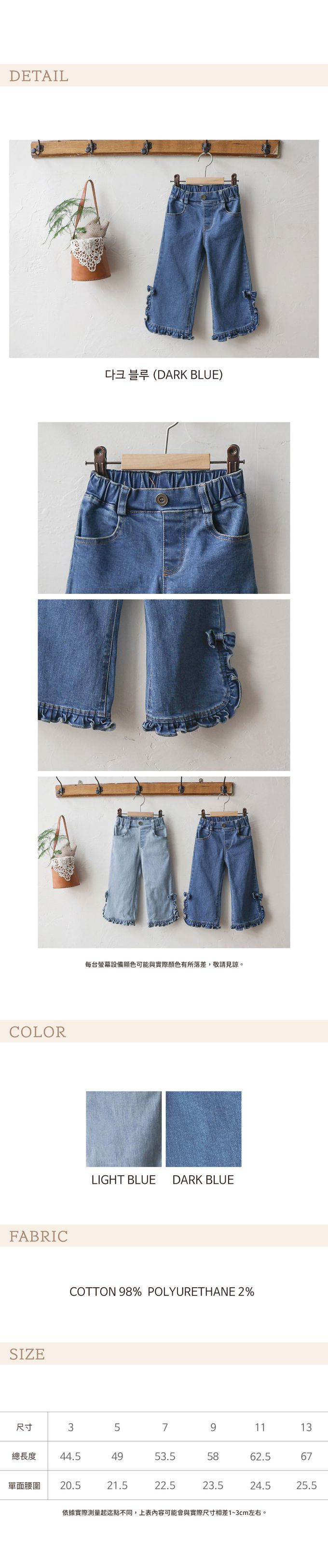 • 品名:後鬆緊彈性荷葉邊點綴牛仔褲