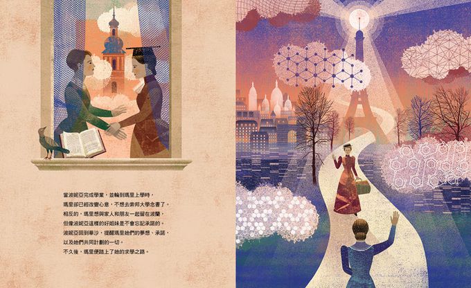 這顯示了這位跨域得過兩次諾貝爾獎的波蘭科學家,對世界的傑出貢獻;但也點出了國內外皆然,大眾普遍對於女性科學家們的不認識。那起碼,我們先從認識不同面向的瑪里.居禮開始吧!《科學姐妹:瑪里.居禮和她姐姐的原子力量》用有力量的文字搭配有質感的插畫,帶我們一起認識瑪里.居禮的成長過程、與背後支持他的重要力量。