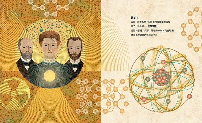 插圖中,原子在瑪里的日常、在瑪里的研究、在瑪里的教學,展現出瑪里對原子的投入,也展現了原子的力量!透過閱讀,孩子將看到科學家在生活日常中溫暖的人際情誼、熱情的探究學習!