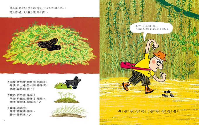 故事裡,嗯嗯太郎出門後,與大猩猩、貍貓、斑馬一一相遇,面對不同動物角色的煩惱,在翻閱下一頁前,師長不妨與孩子一起猜猜看、共同互動討論:究竟嗯嗯太郎會分別給這些動物什麼建議呢?