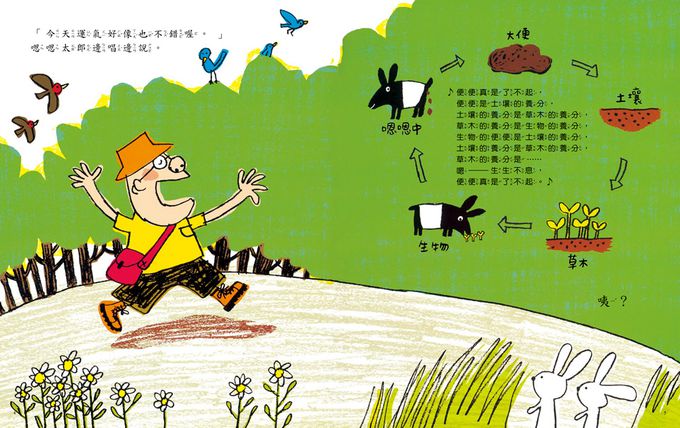 閱讀時,跟著幽默逗趣的主角嗯嗯太郎與不同的動物相遇、觀察牠們的便便和廁所,就能讓孩子邊閱讀邊簡單認識動物們與牠們的排便習性及生態。