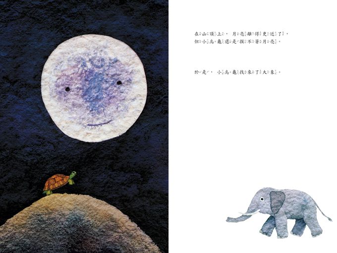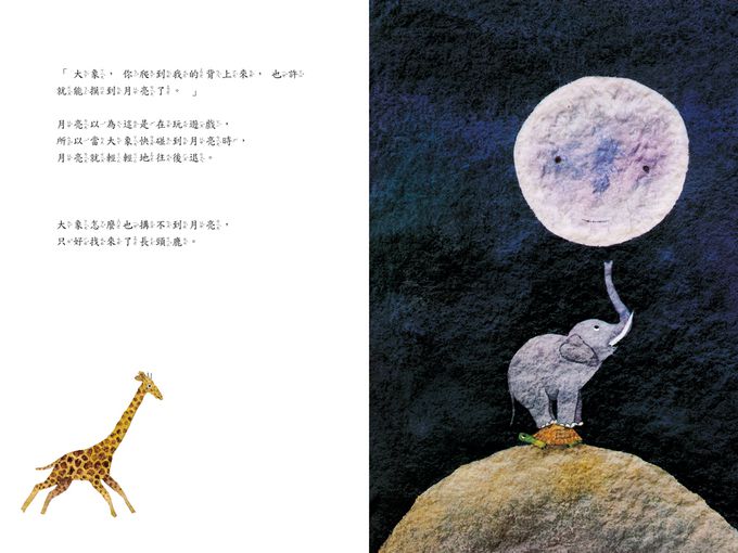 小烏龜努力地爬到山頂上,還是搆不著月亮,於是又找來了大象、長頸鹿、斑馬一起疊羅漢!本書運用簡單的故事,引導孩子思索「追尋的夢想,也許看似遠在天邊,其實也許就近在眼前」的人生哲理,並同時培養孩子多與人團結合作、互相幫助的價值觀。