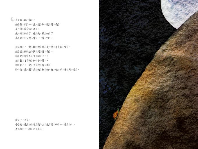 瑞士兒童心理學家皮亞傑(Jean Piaget)曾經說過:「所有的孩子都認為月亮會跟著人走。」孩子對於夜夜出現在頭頂、窗外的那張大圓臉,充滿了好奇。這本書以「動物想吃一口月亮」和「月亮跟動物開玩笑」作為故事的主幹,一定能引起孩子濃濃的興趣。