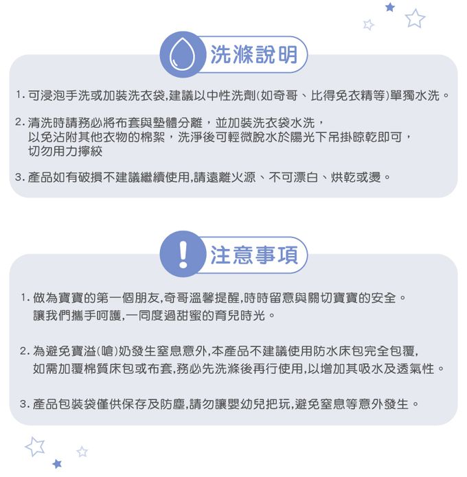 1.為避免寶寶溢(嗆)奶發生窒息意外,本產品如加覆棉質枕套,請務必洗滌後再行使用,以增加其吸水及透氣性