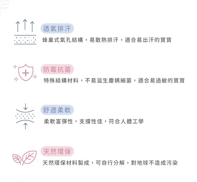 2.透氣排汗-蜂巢式氣孔結構使其易於透氣、散熱,對於容易出汗的嬰幼兒,能夠保持乾爽的睡眠環境