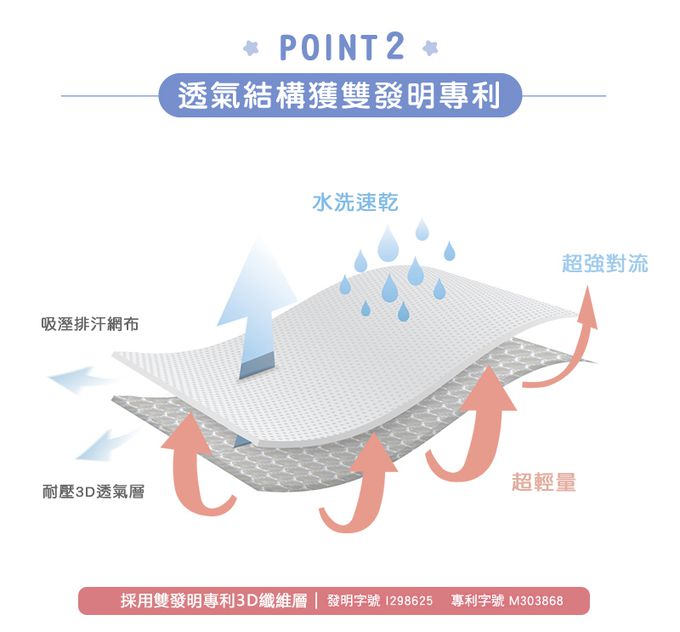 3.結合吸濕排汗紗、3D立體柔軟纖維與專利纖維透氣墊體等四層結構,形成完美的空氣層,具通風透氣及保溫隔絕雙重功能,常保乾爽舒適,冬暖夏涼,四季皆宜