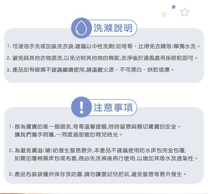 1.為避免寶寶溢(嗆)奶發生窒息意外,本產品如加覆床包,請務必先洗滌後再行使用,以增加其吸水及透氣性。