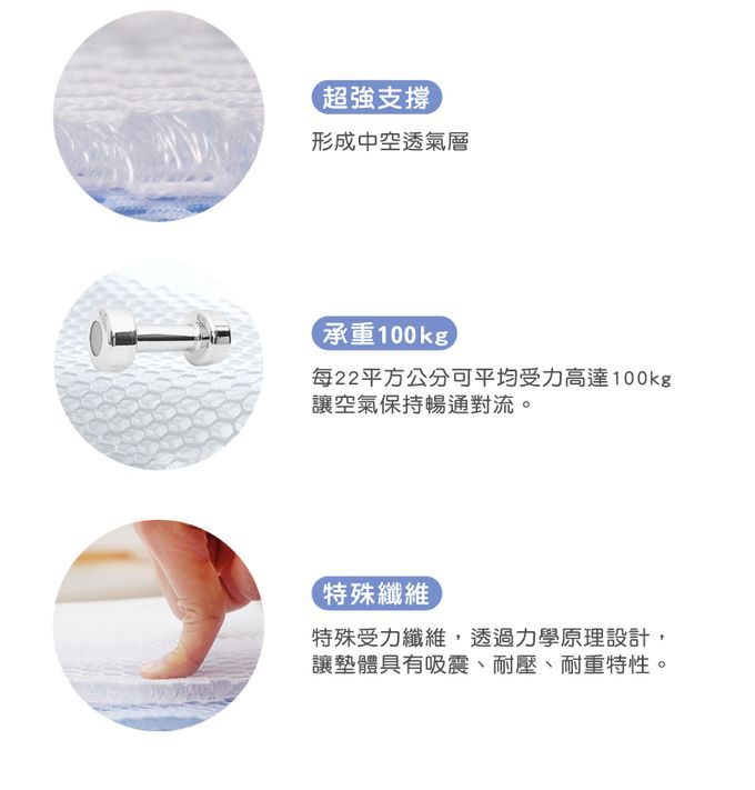 5.特殊受力纖維透過力學原理設計後,讓墊體具有吸震、耐壓、耐重的優異特性,每22cm2可平均受力高達100kg,讓空氣保持暢通對流