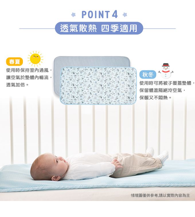 春夏季使用時保持室內通風,讓空氣於墊體內暢流,通風又透氣;秋冬季使用時可將被子覆蓋墊體,保留體溫隔絕冷空氣,保暖又不悶熱。
