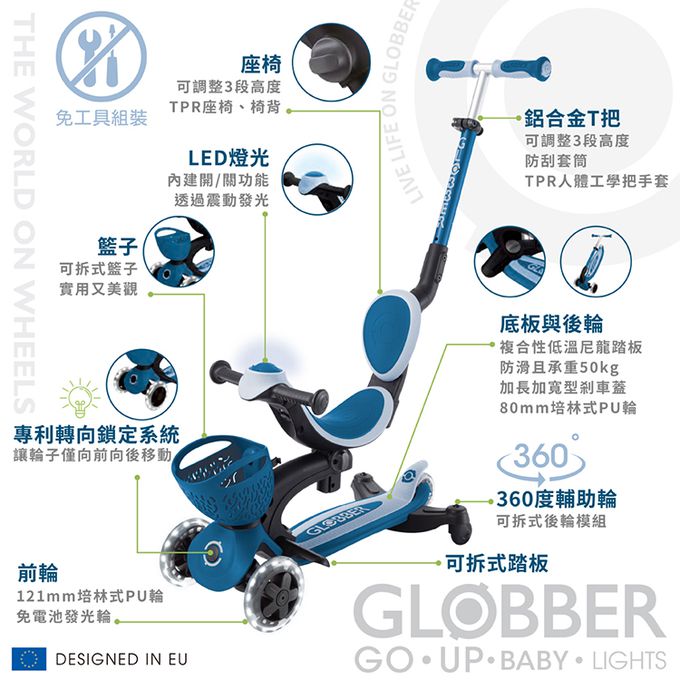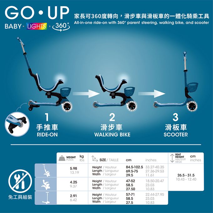 注意事項:年齡:約15個月至6歲(因每個孩子成長速度不同,僅供參考) 限重:20公斤(滑步車模式);50公斤(滑板車模式) 材質:聚丙烯、可熱塑性橡膠、鋼、鋁、尼龍+玻纖、聚氨酯 淨重:約6公斤(全車) 尺寸:詳細尺寸請見說明圖 產地:法國設計 中國生產 保固:2年(車體保固2年,消耗性零配件非保固範圍 Ex:螺絲、輪子、剎車蓋等) 商品檢驗標識號:M54766 *以上規格若與商品有出入,以原廠出貨規格為準! 【注意事項】 ● 請穿戴防護裝備騎行滑板車,且勿在交通道路上使用,以免對人身安全造成危害,並在成人監督下使用。 ● 本產品為箱車出貨,需自行簡單組裝。 ● 規格及重量以實車為準,GLOBBER原廠保留規格變動權利。 ● 商品圖檔顏色因電腦螢幕設定差異會略有不同,以實際商品顏色為準。 ● 此商品包含不可更換的電池,當電池耗盡時請更換整個電子模組。 ● 法國GLOBBER品牌近幾年因應歐盟環保政策,包裝逐漸更改採用無塑包裝,運送過程中內部包裝紙材可能因晃動或摩擦造成些為破損或產生屑屑,此皆為正常現象非拆箱使用過痕跡,請可以接受再下單! ● 商品經拆封組裝後即不能退換貨(商品瑕疵除外)。