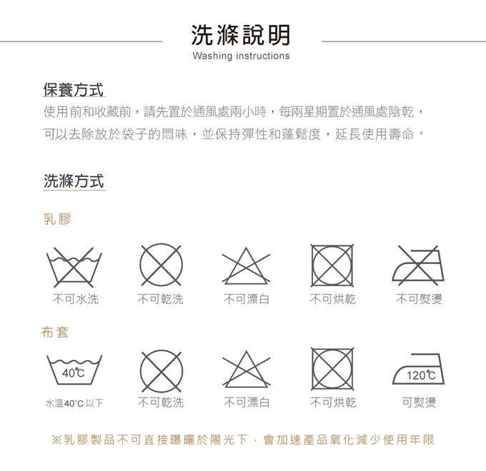 可水洗/不可乾洗/不可漂白/不可烘乾/可蒸氣熨燙