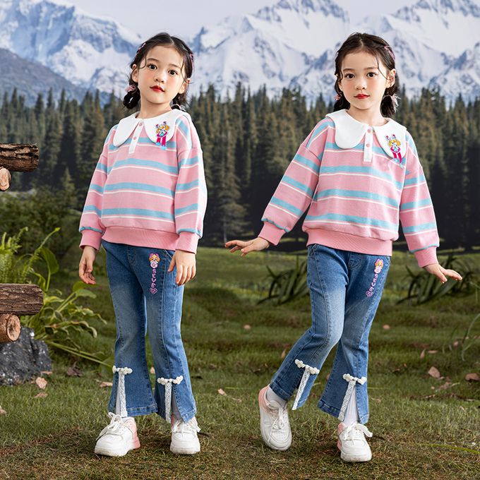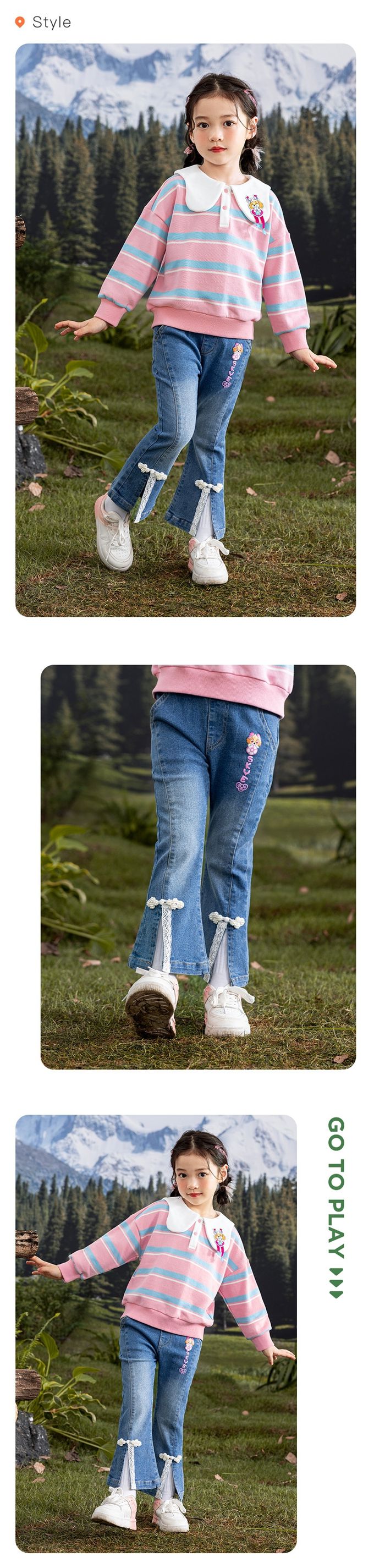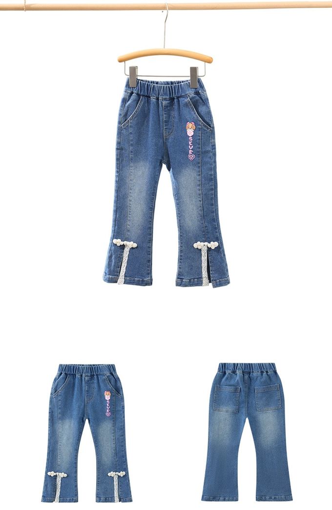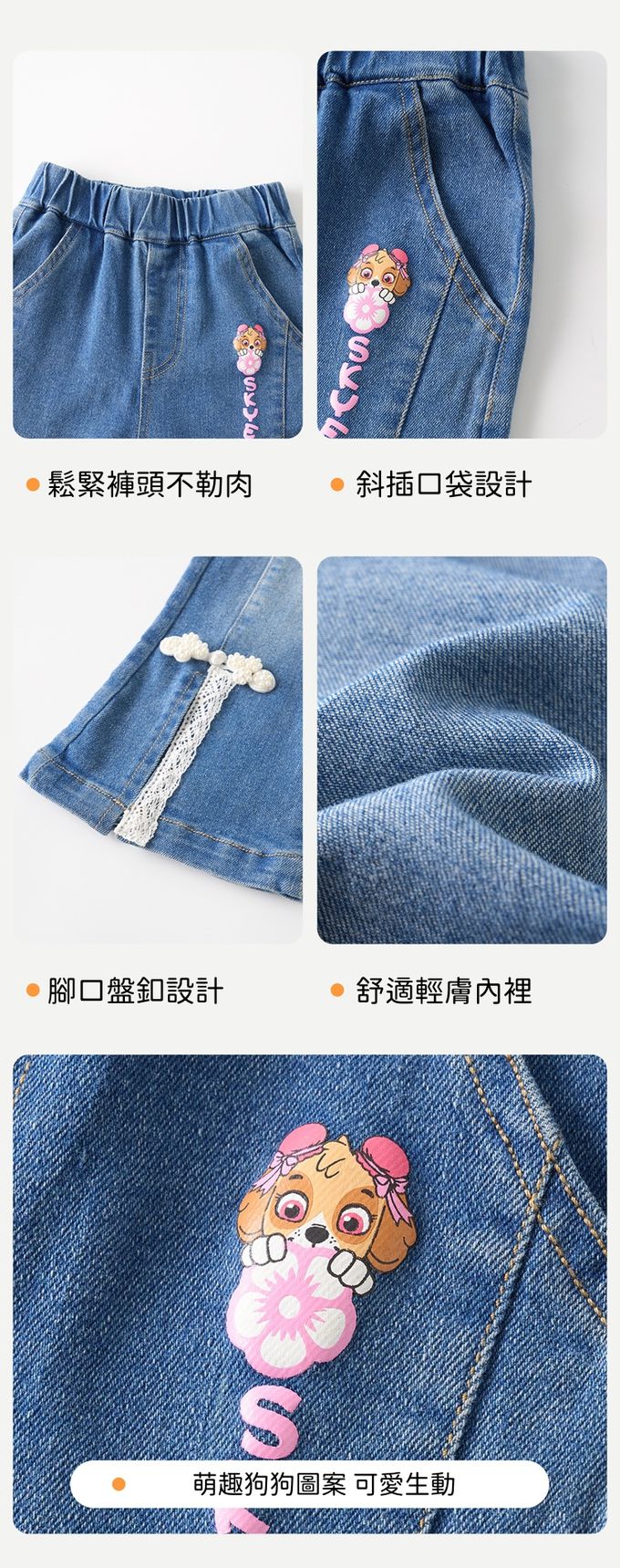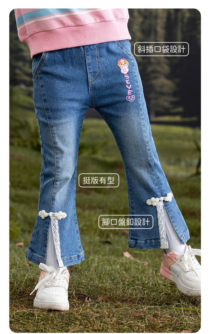 品名:卡通汪汪隊前開衩蕾絲拼接喇叭牛仔褲