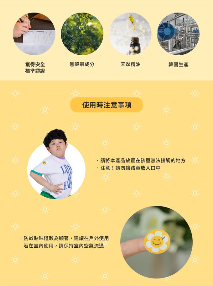 • 注意事項:1.不可食用,僅做為驅蚊用途,如不慎食用或吞嚥內容物,請立即採取急救措施並盡速送醫 2.請勿直接貼在皮膚上,若不慎沾道口、眼等,請用清水洗淨 3.使用完請將密封袋關閉並置於陰涼處保存,避免陽光直射 4.若有感到不適請立即停止使用 5.避免放置於高溫溼熱或陽光直射的環境 6.請放置嬰幼兒觸碰不到的位置,以免造成危險 7.幼童請於大人陪同下使用 *本品含桉葉油醇、芳樟醇、檸檬烯、香葉醇、法尼醇等,蠶豆症或其他特殊體質者請諮詢專業醫療建議後再行使用