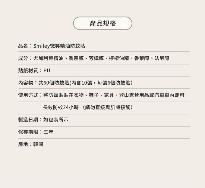 • 品名:微笑防蚊貼(60枚/包)
