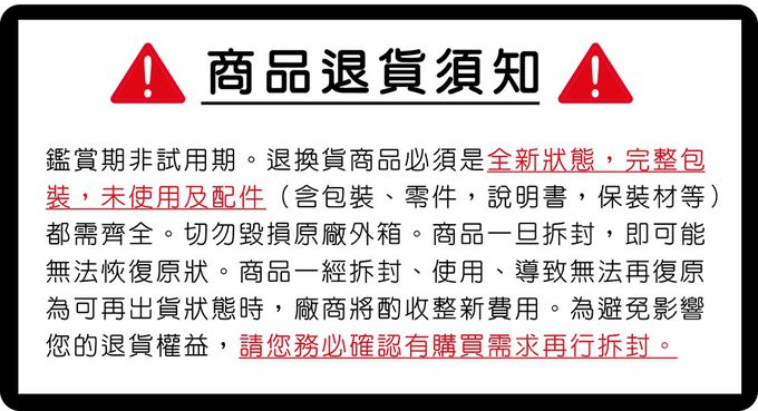 您所購買的商品享有7天的鑑賞期/猶豫期權益,但此期間並非試用期,您所退回的商品必須是未經使用的全新狀態,包含完整包裝、配件、說明文件及贈品等。