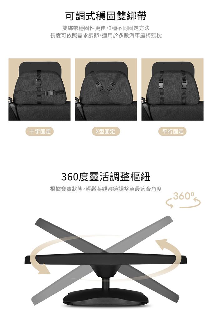 雙綁帶穩固性更佳,適用於多數汽車座椅頭枕