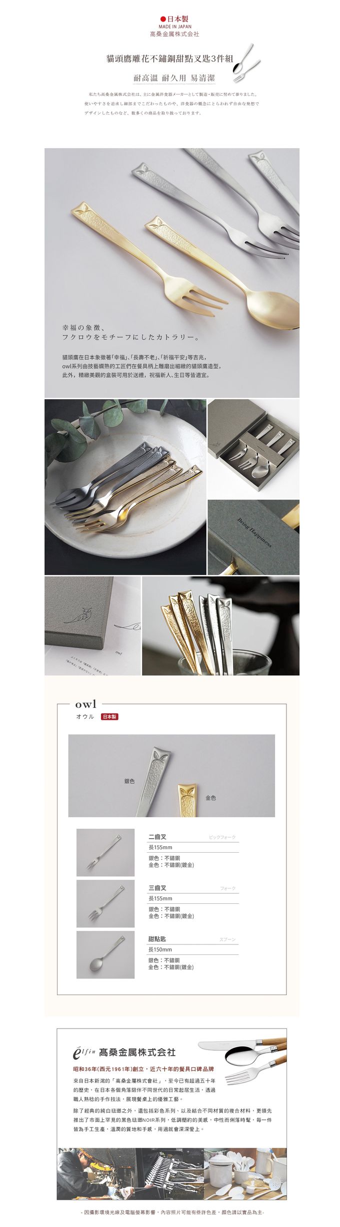 品名:日製貓頭鷹雕花不鏽鋼甜點叉匙3件組-多色可選
