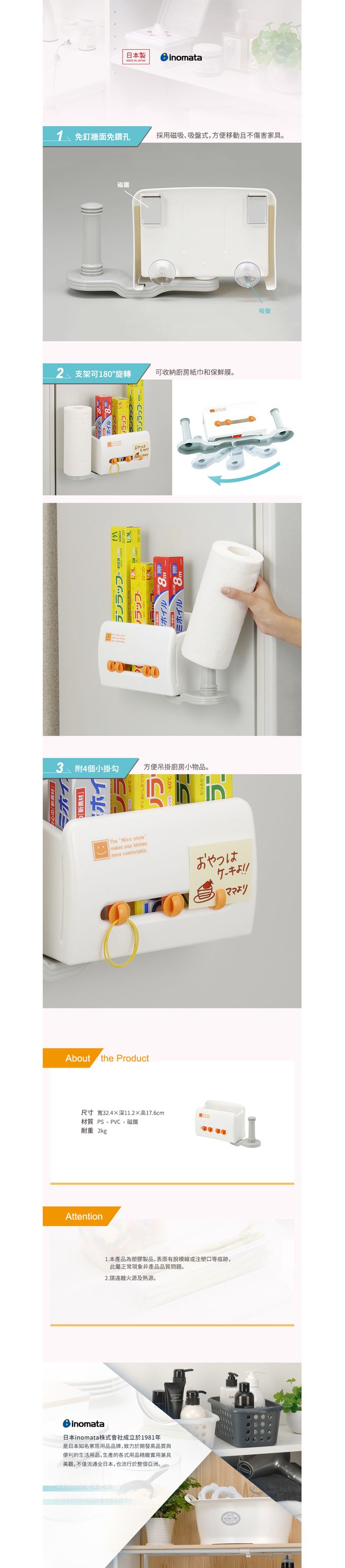 品名:日本製多功能磁吸式紙巾架/置物架(附掛勾)