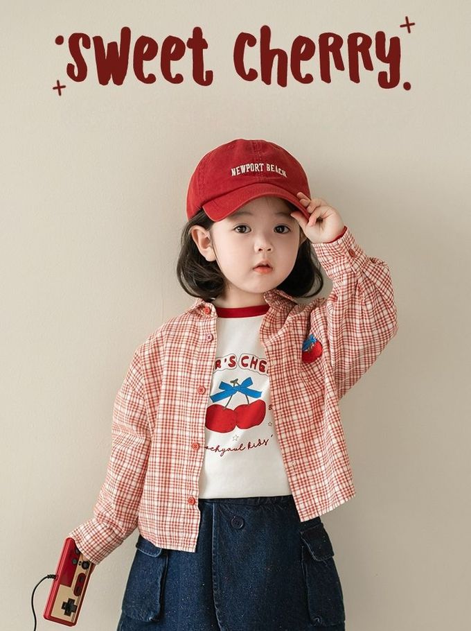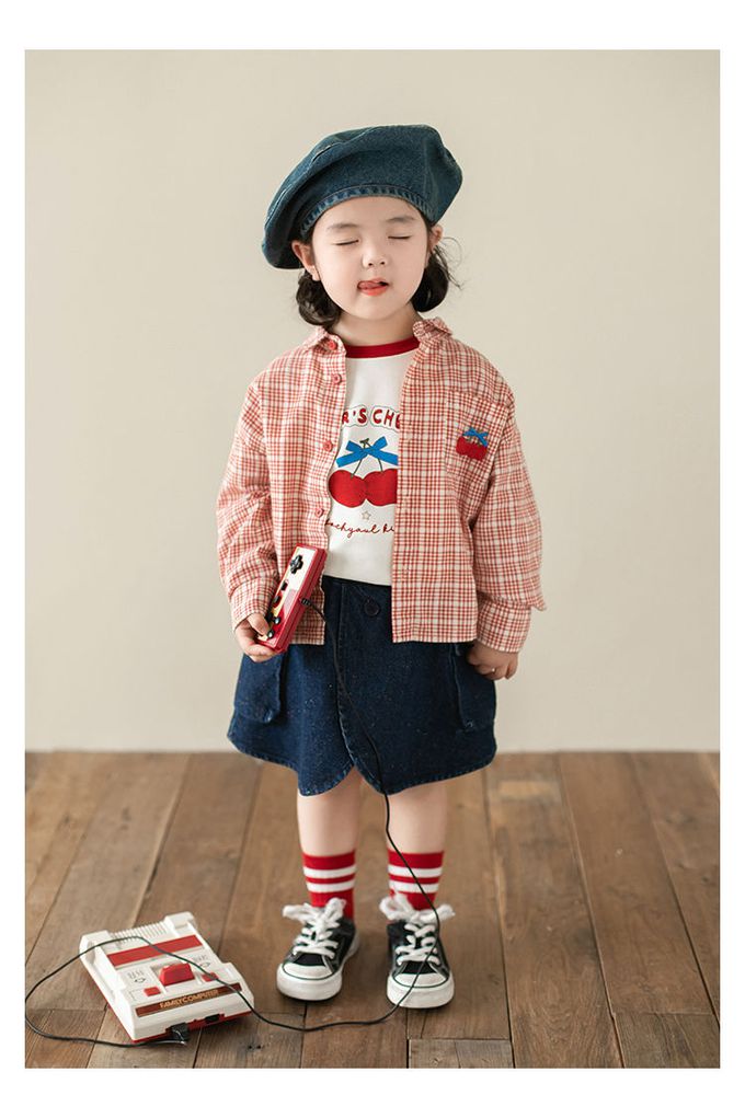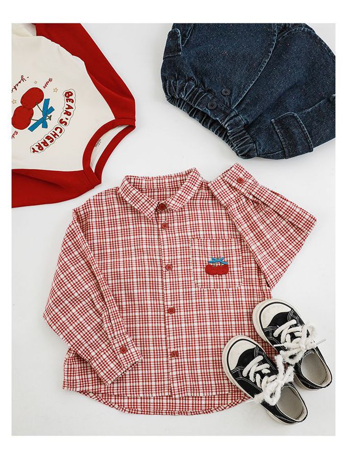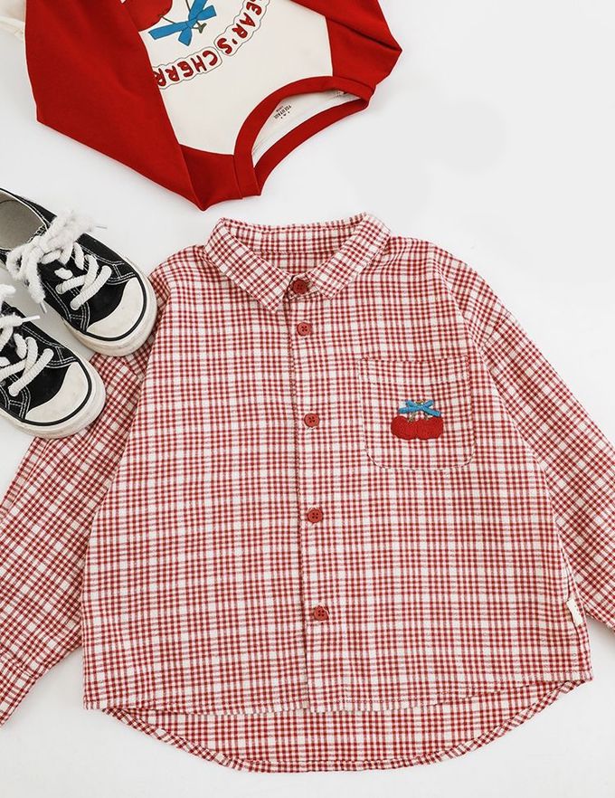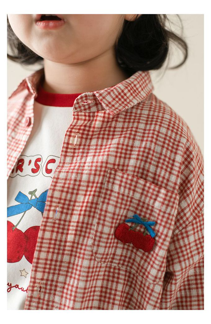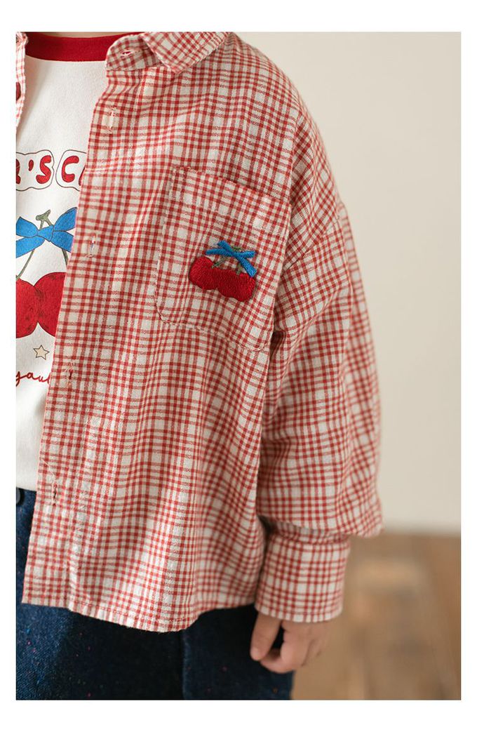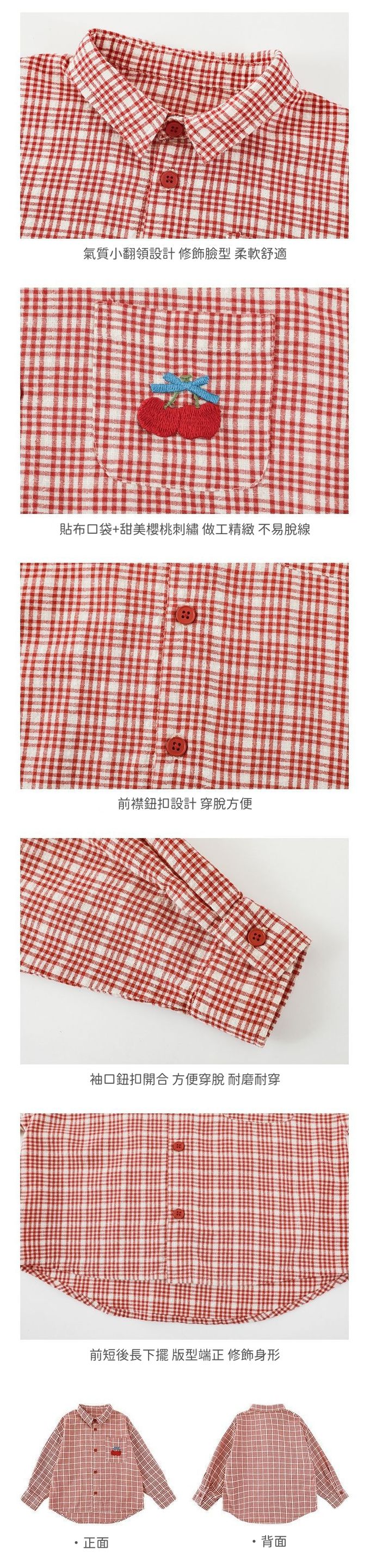 百搭翻領刺繡格紋襯衫/外套-小櫻桃-紅色