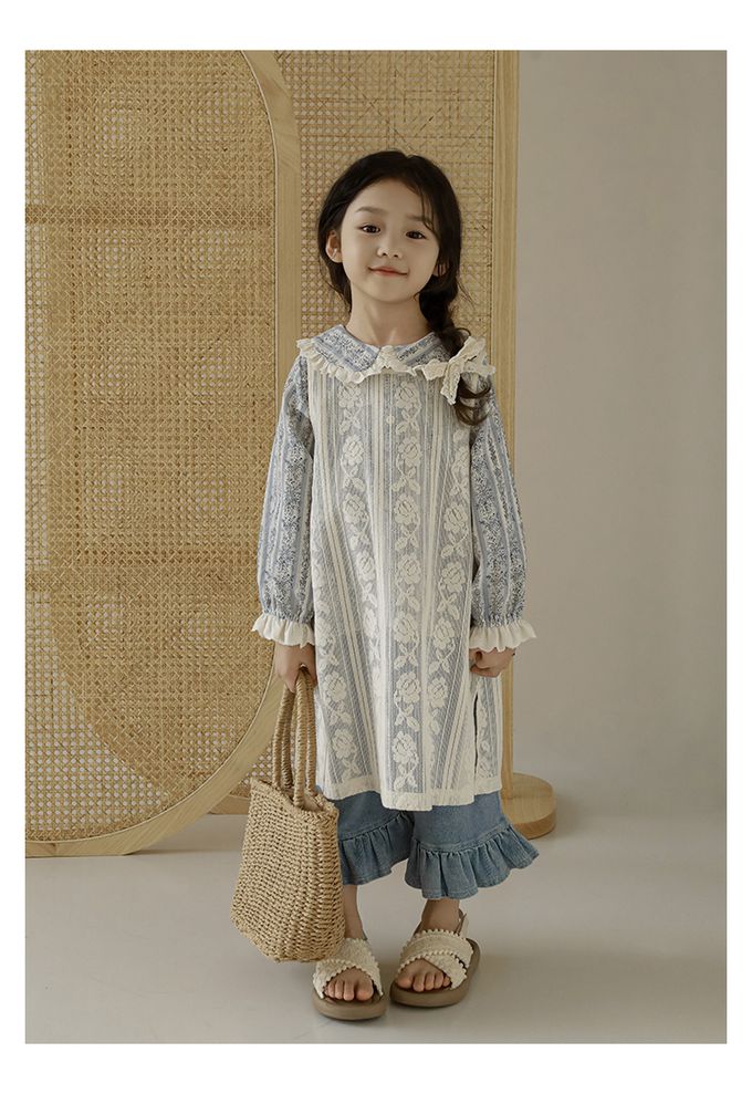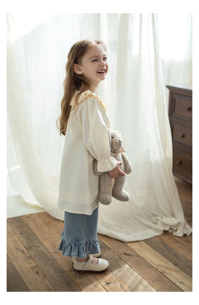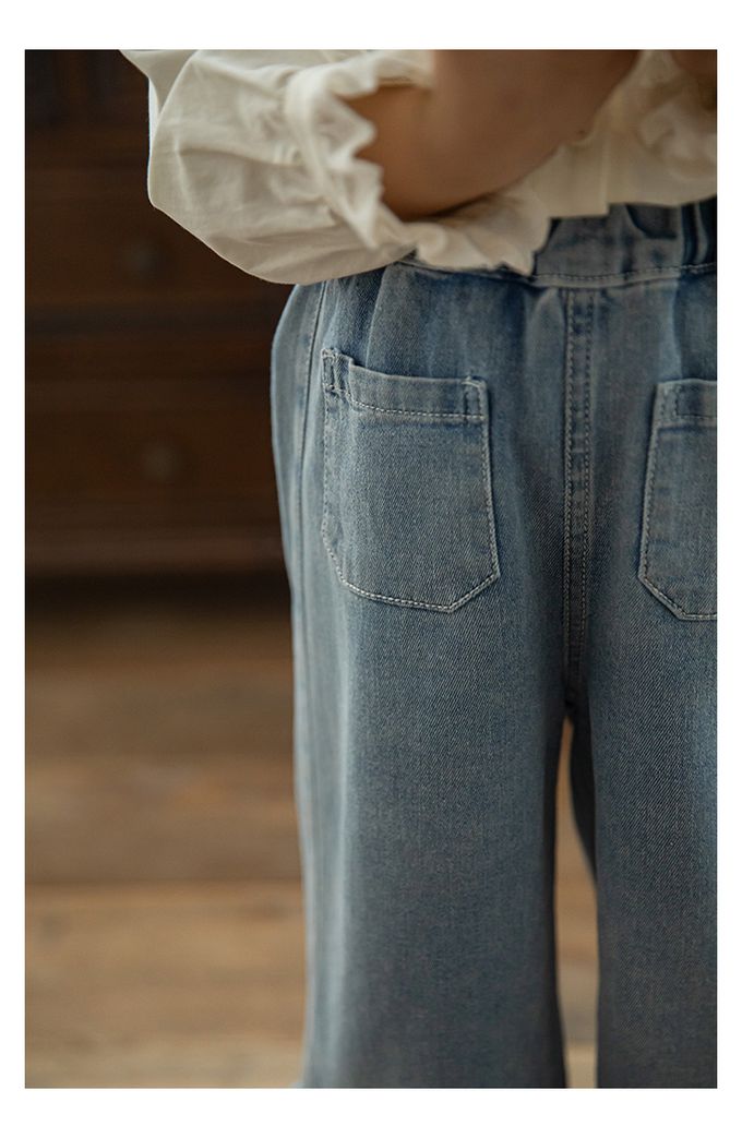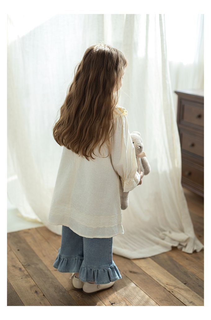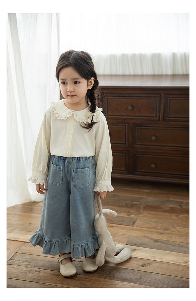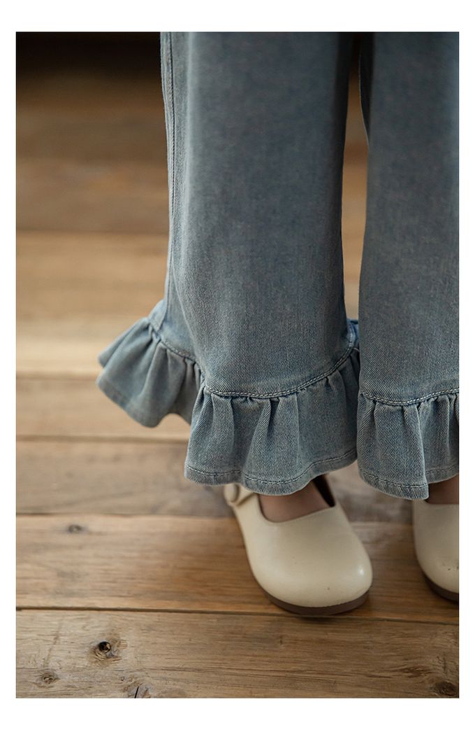 甜美雙口袋荷葉花邊牛仔長褲-淺藍色
