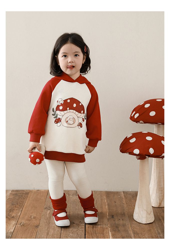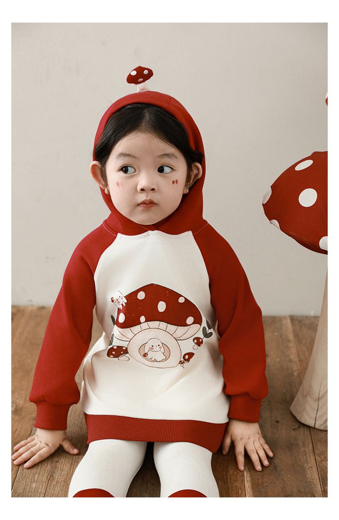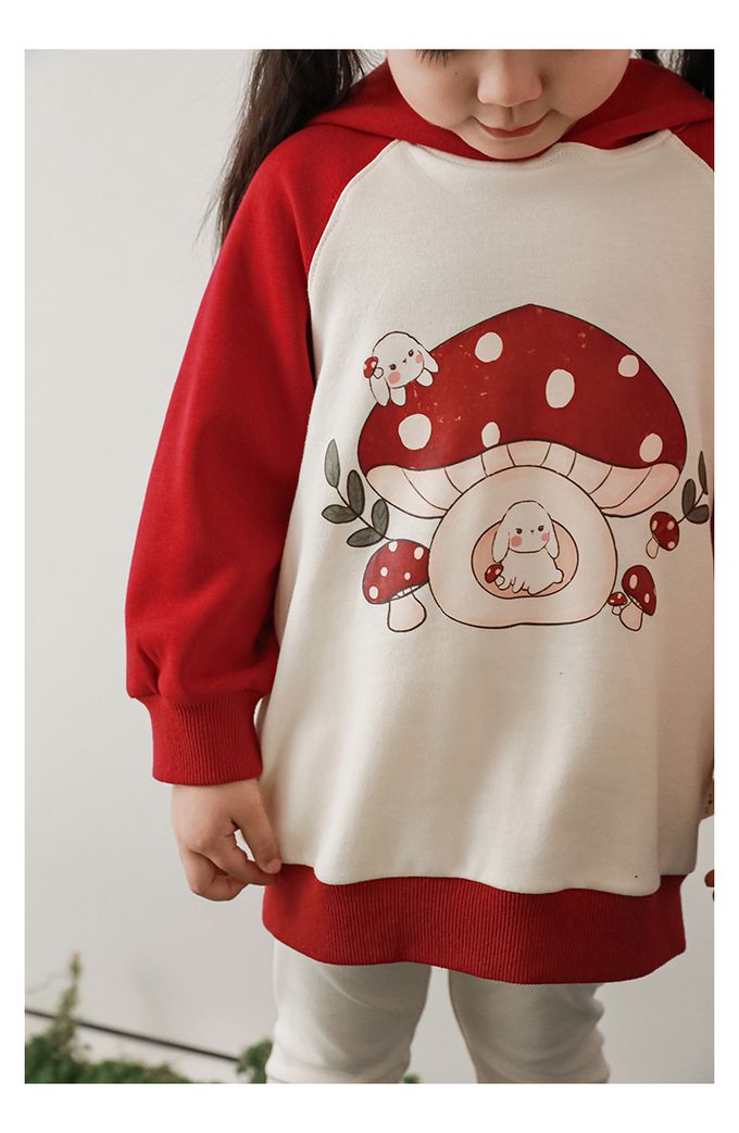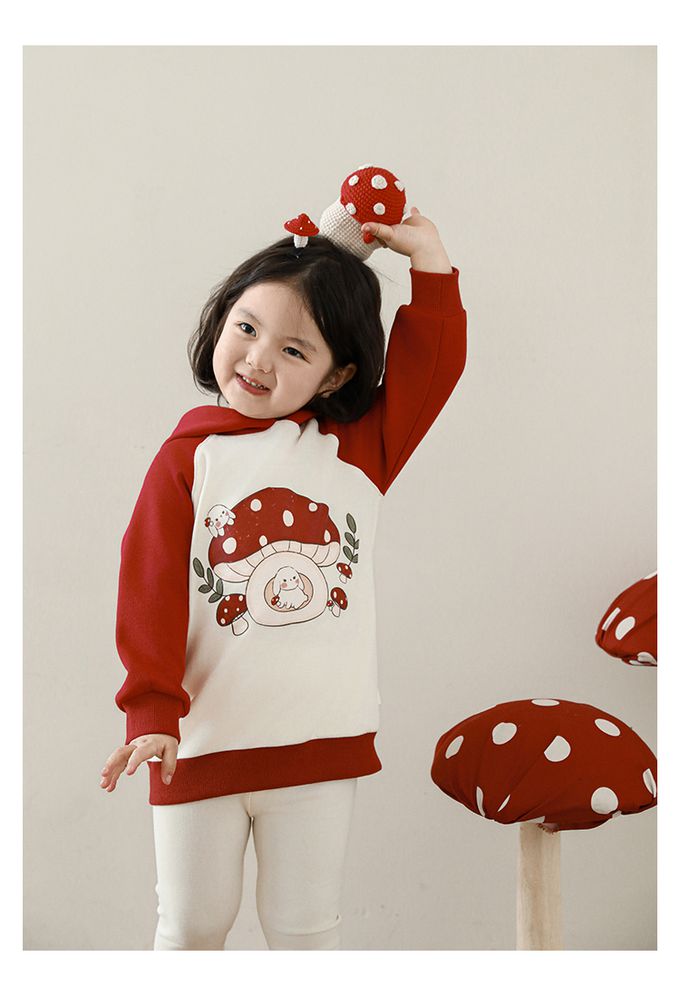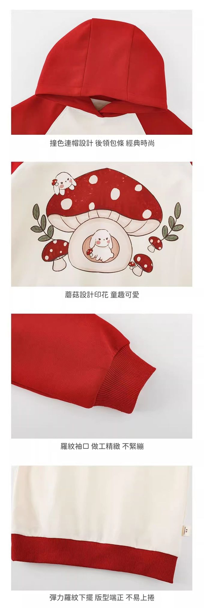 休閒拼色連帽長袖上衣-可愛蘑菇-紅色