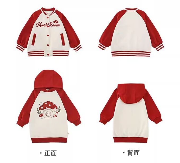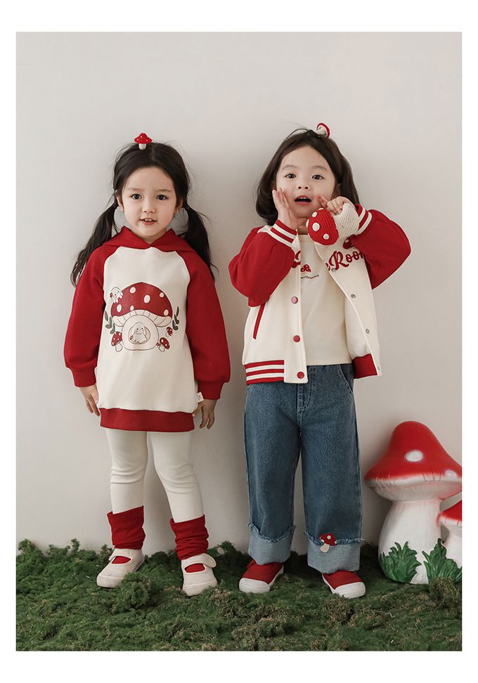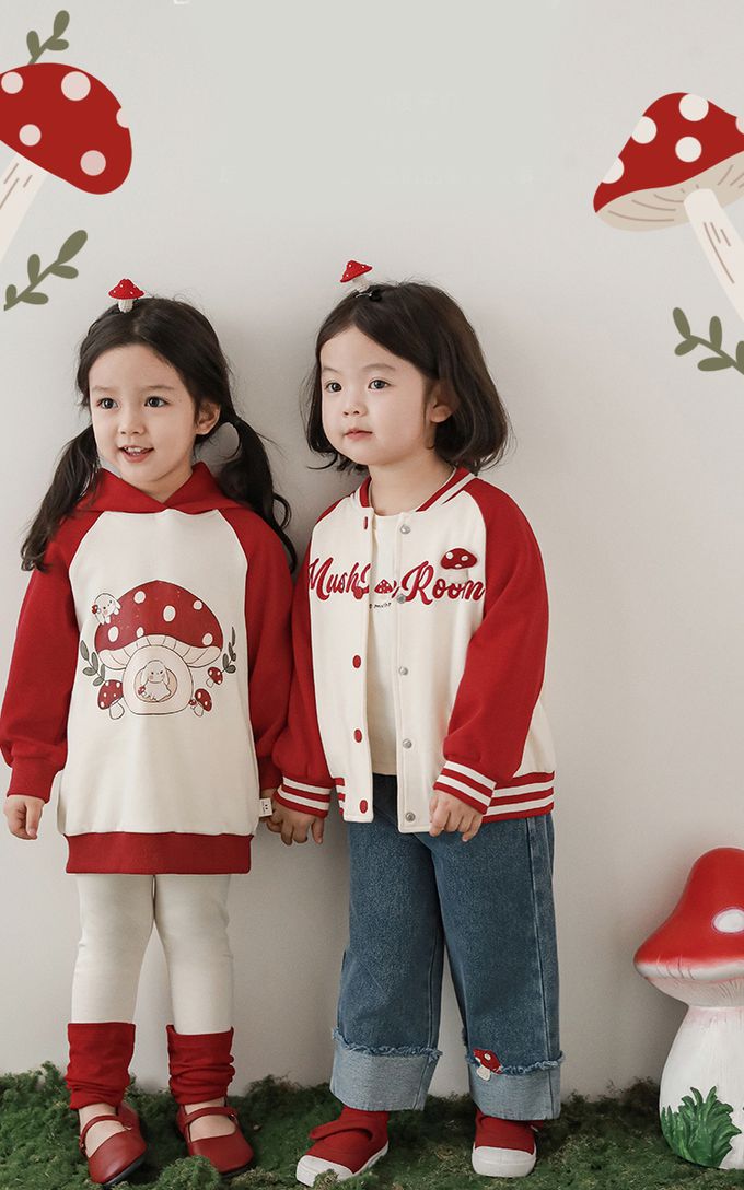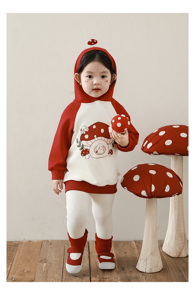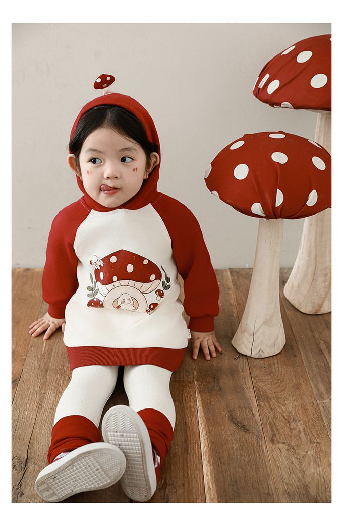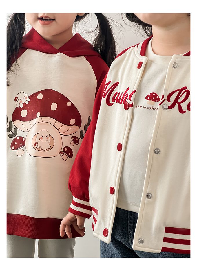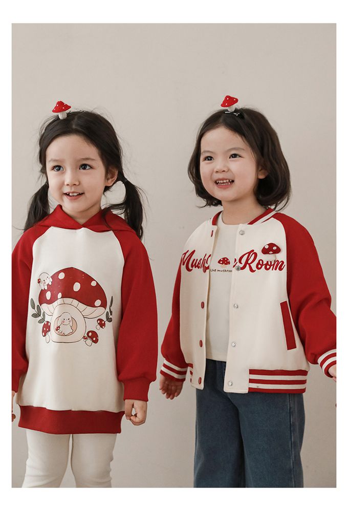 休閒拼色連帽長袖上衣-可愛蘑菇-紅色