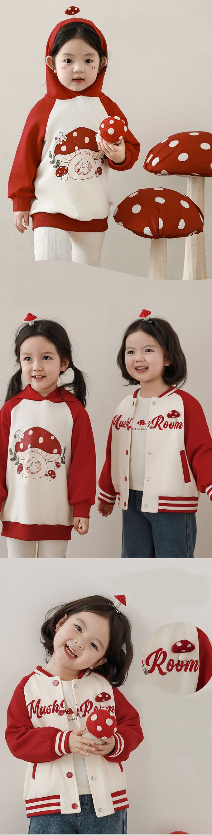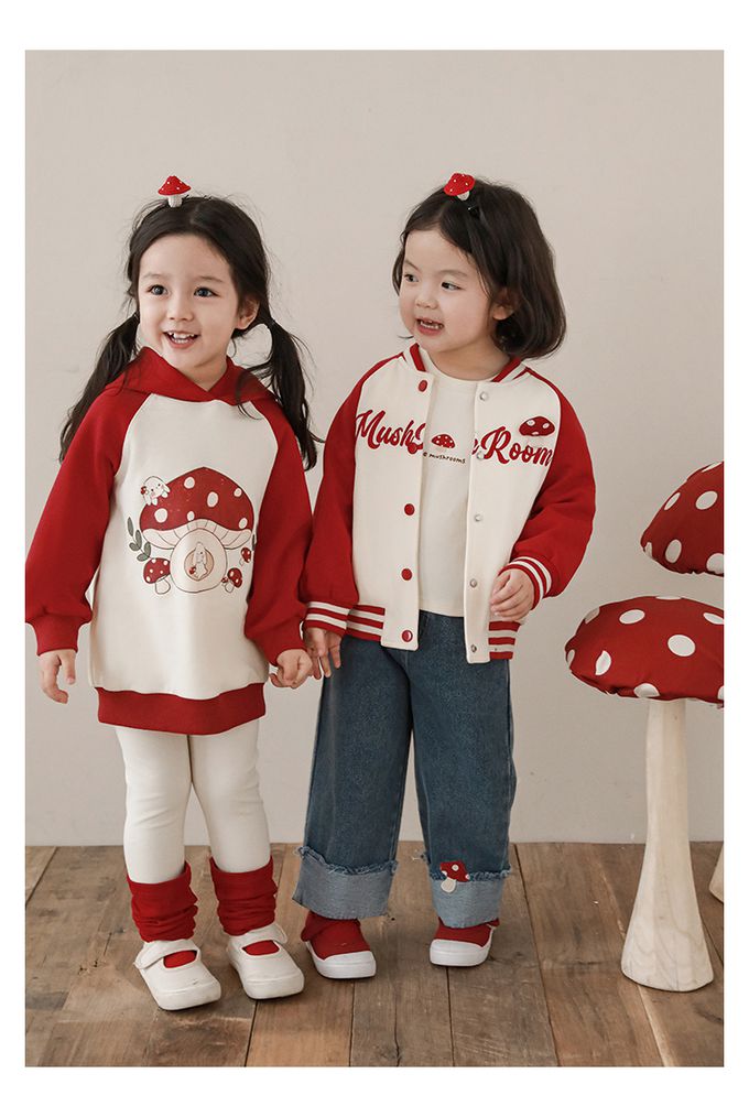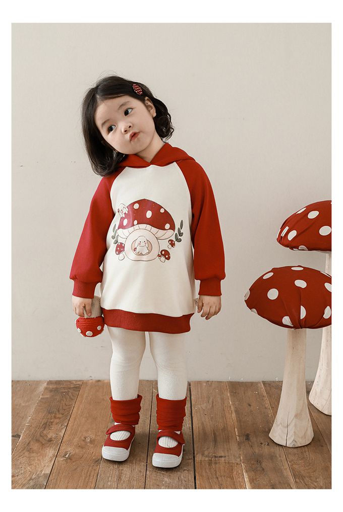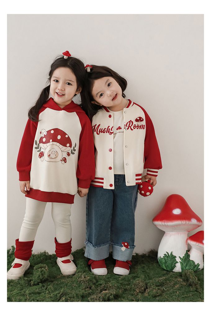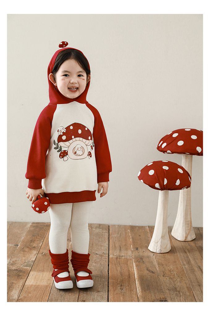 休閒拼色連帽長袖上衣-可愛蘑菇-紅色