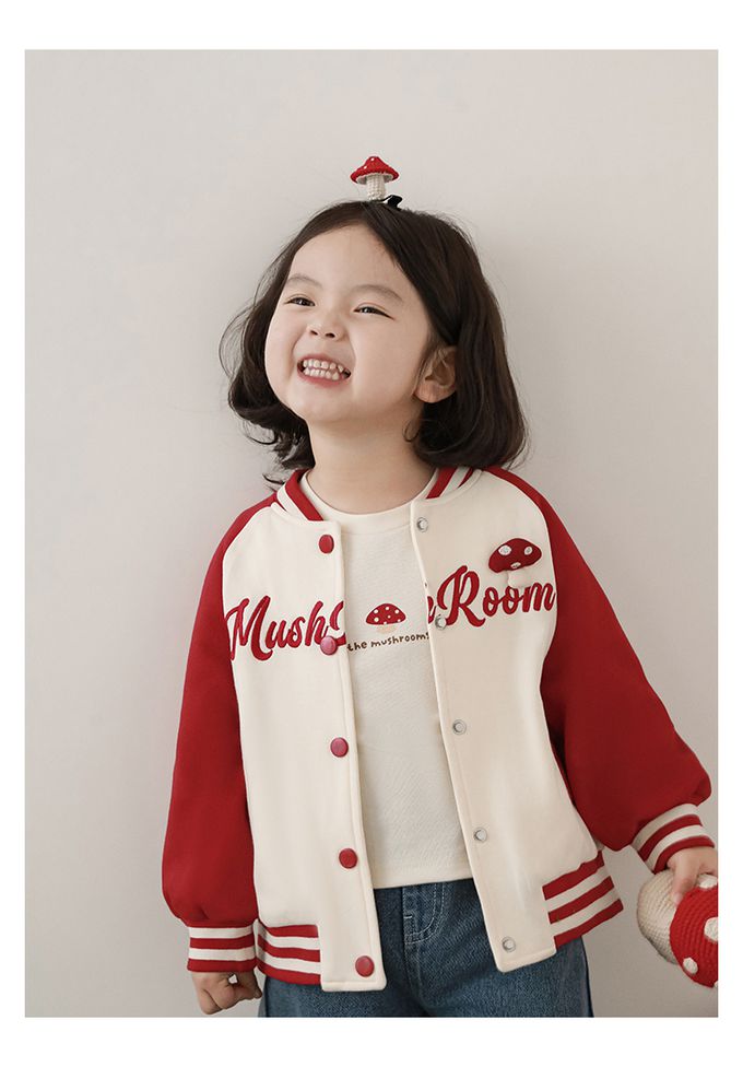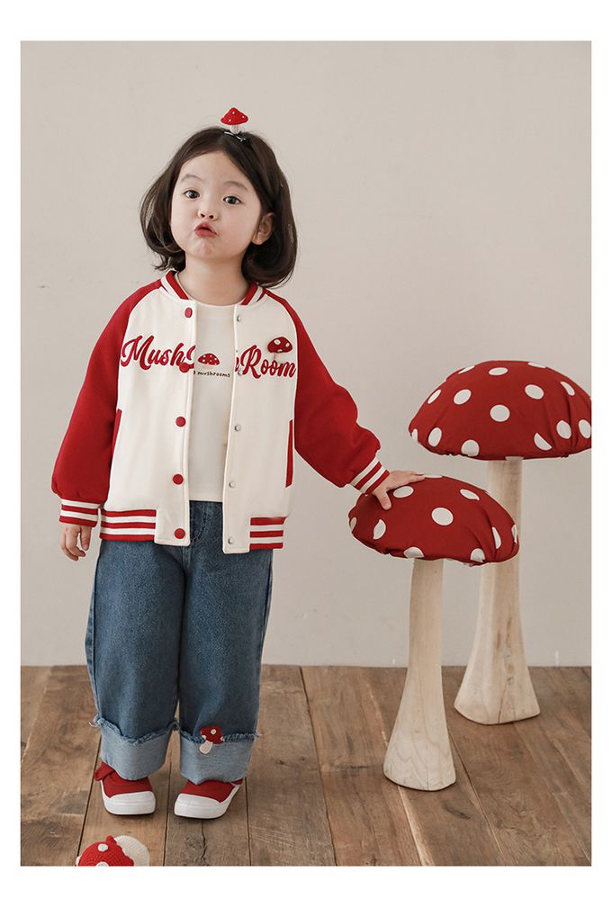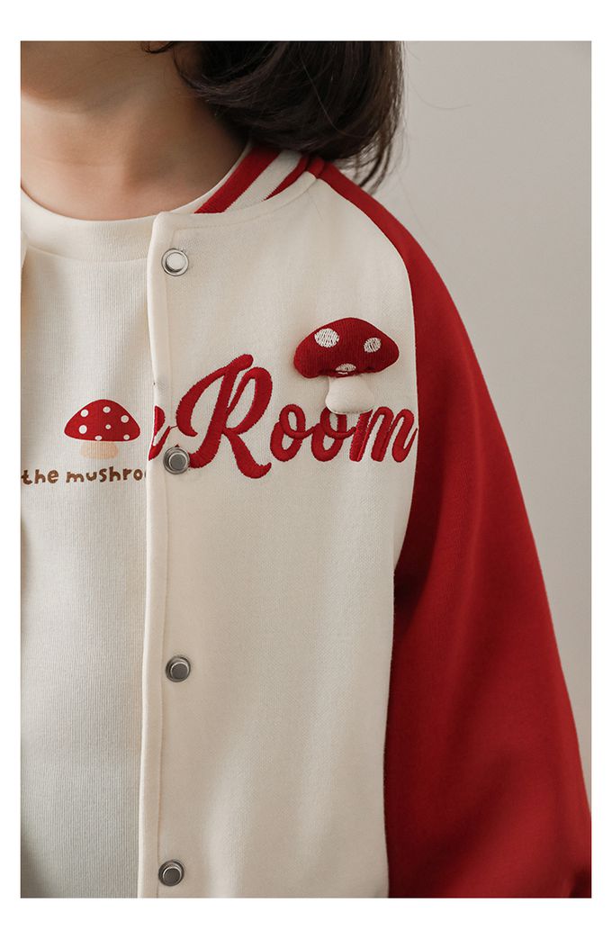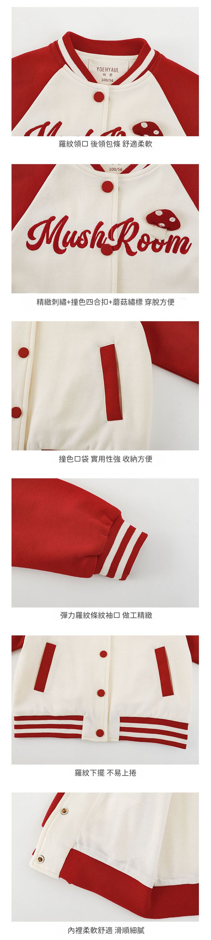 休閒拼色棒球外套-可愛蘑菇-紅色