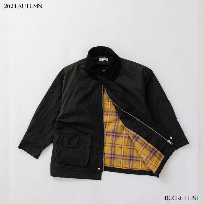 韓國 BUCKET LIST - 翻領工裝內襯格紋中長版外套-黑藍