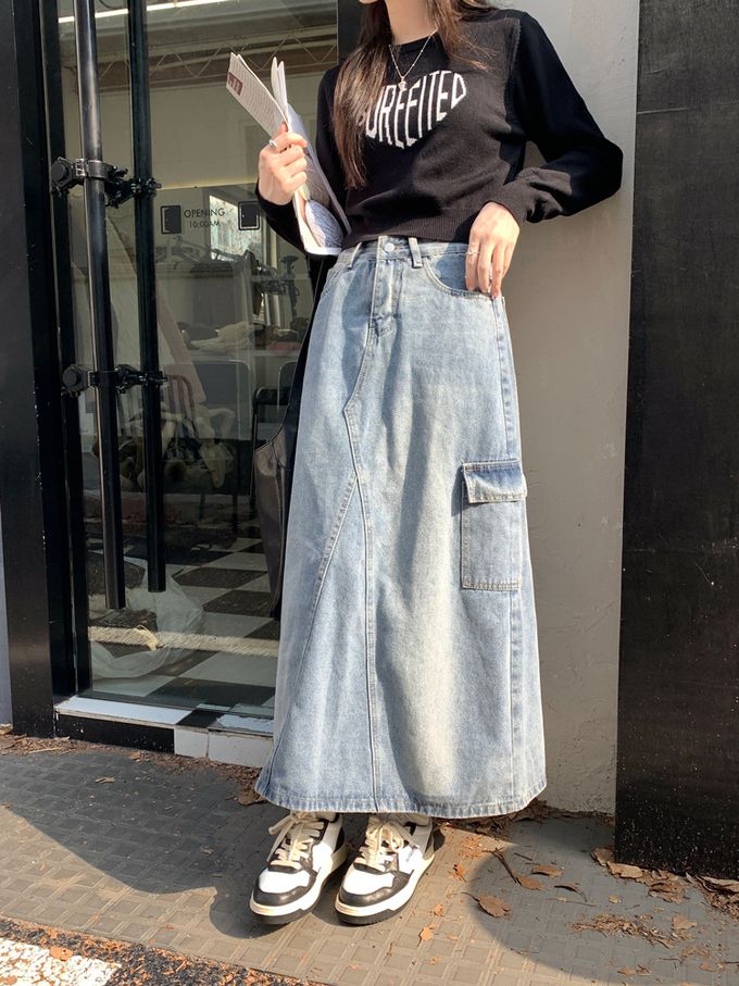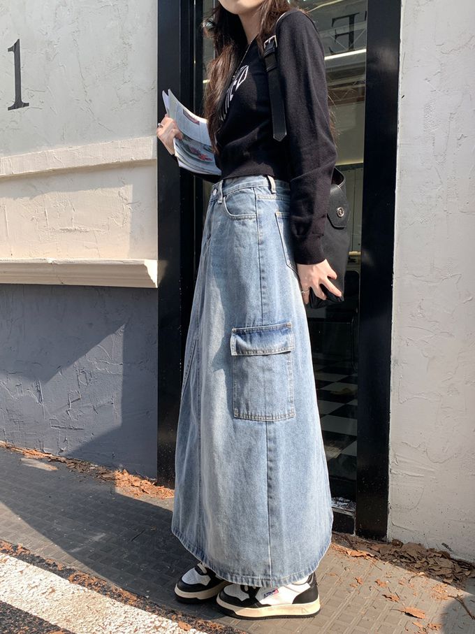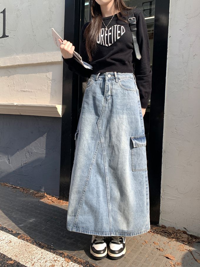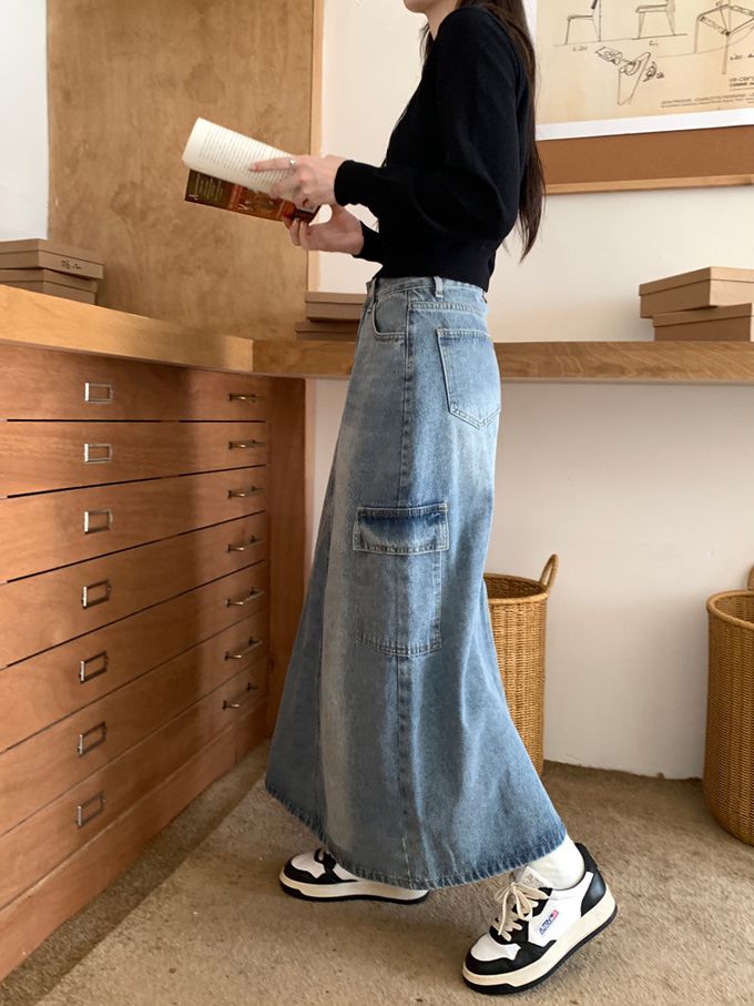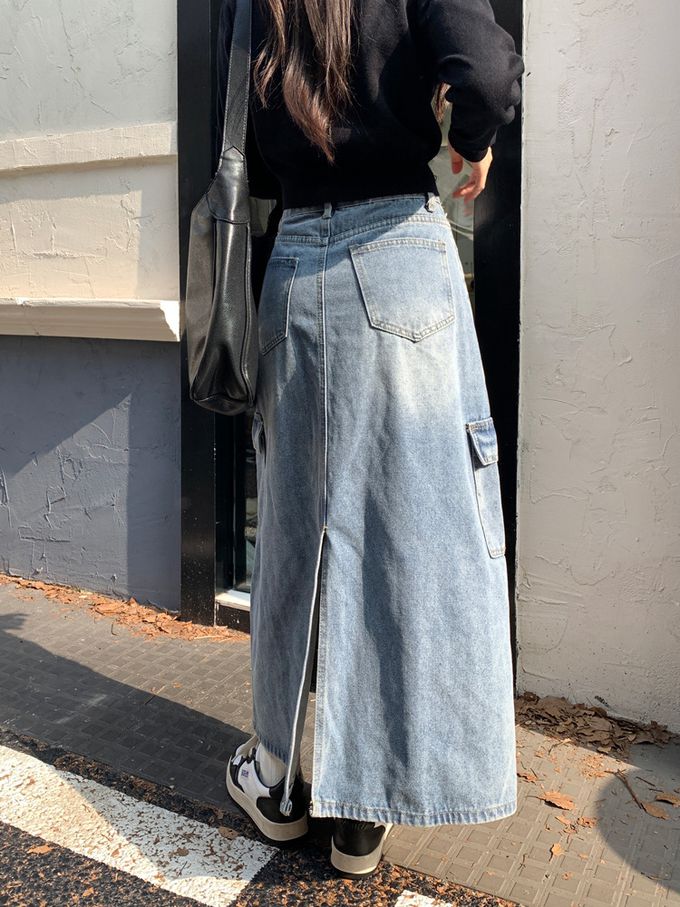 840787 修身顯瘦後開衩工裝牛仔長裙-懷舊藍