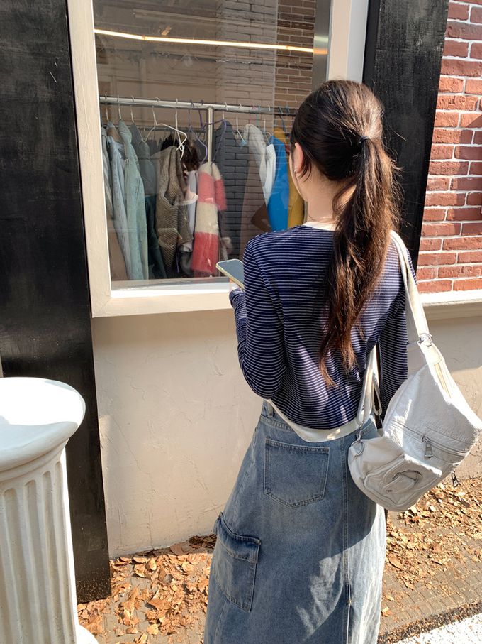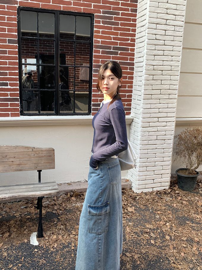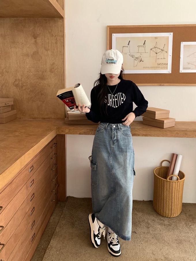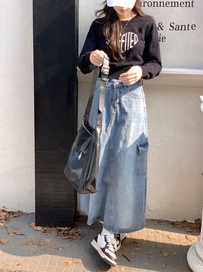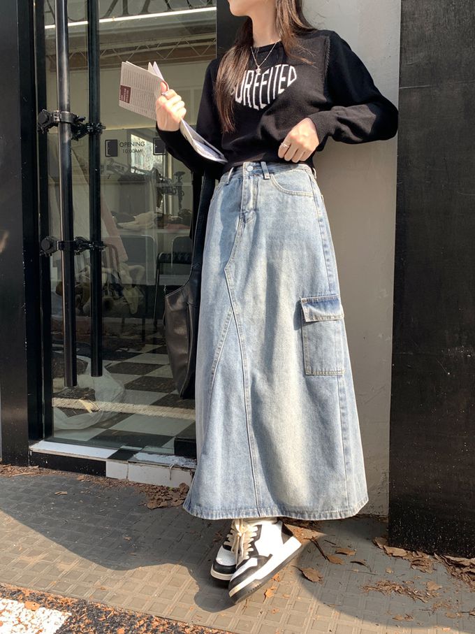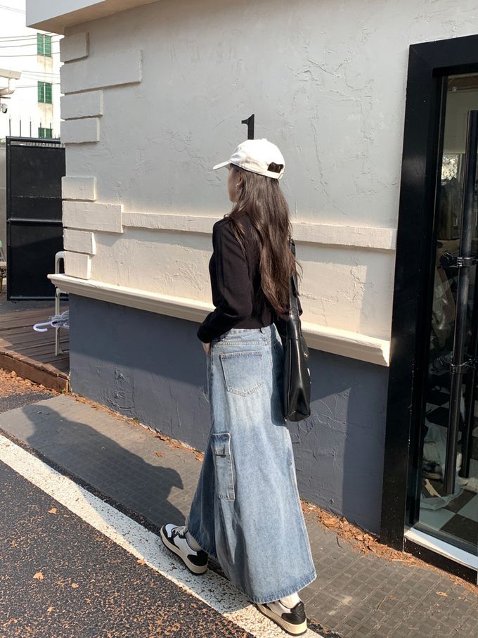 840787 修身顯瘦後開衩工裝牛仔長裙-懷舊藍