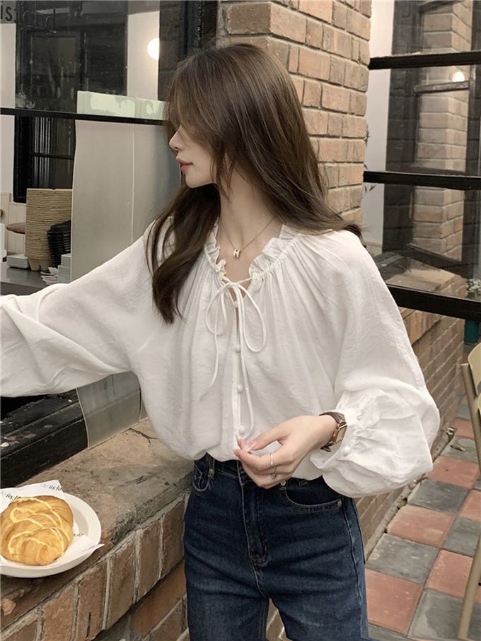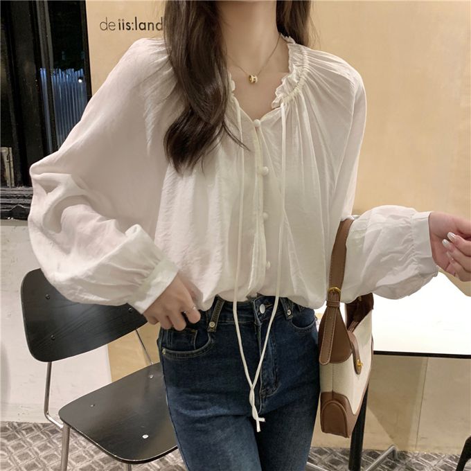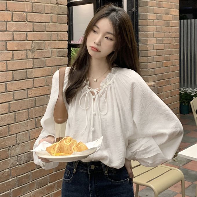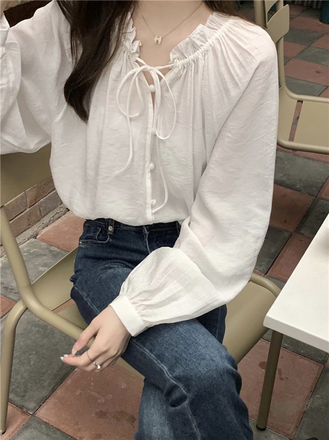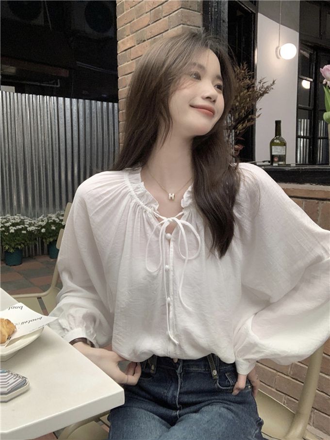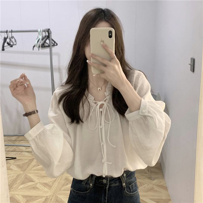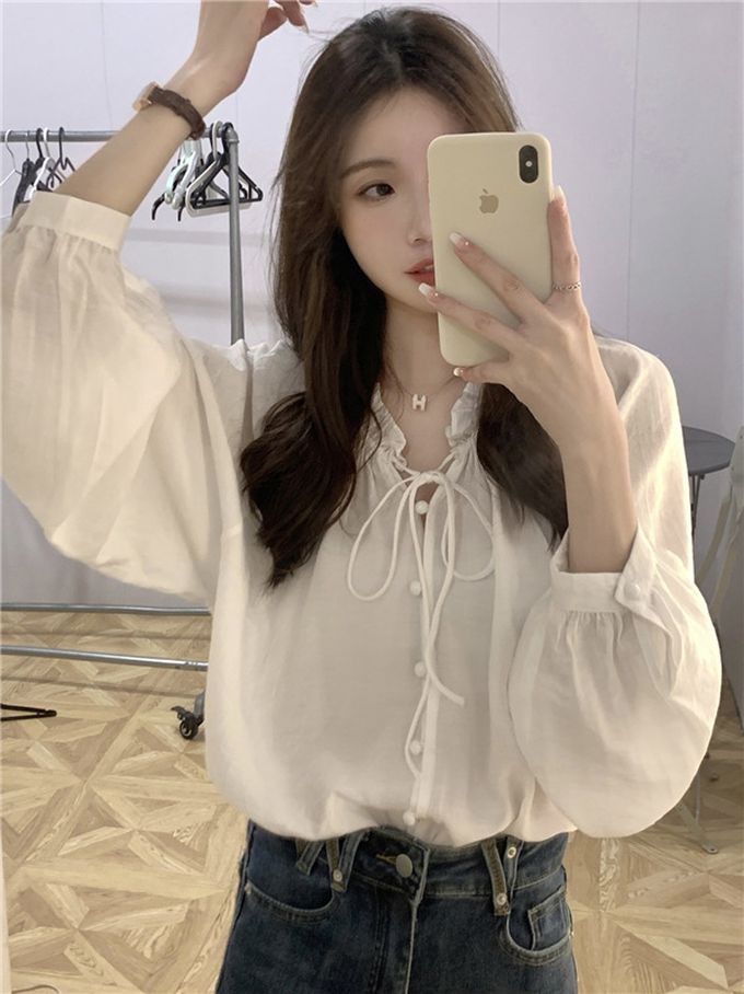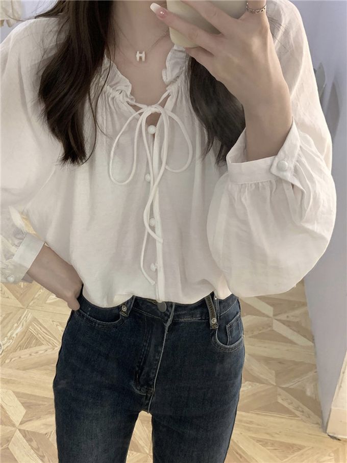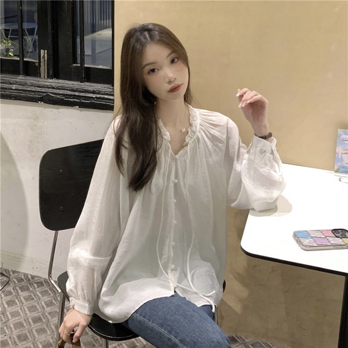 840791 光澤感V領荷葉邊長袖上衣-浪漫紫 (F)
