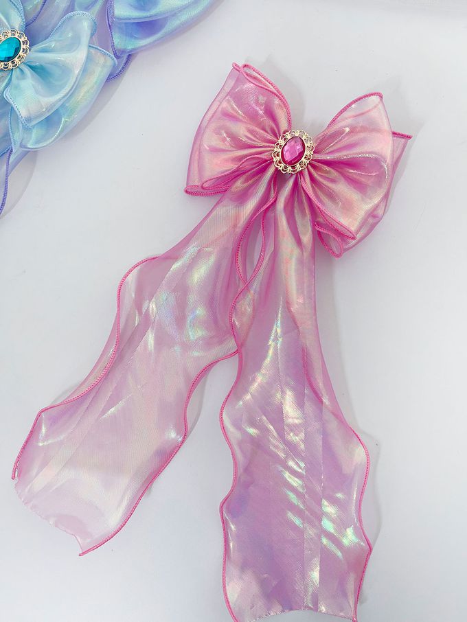 韓國飾品連線 - 韓製歐若拉光澤緞帶蝴蝶結寶石髮夾-粉 (12.5*30cm)