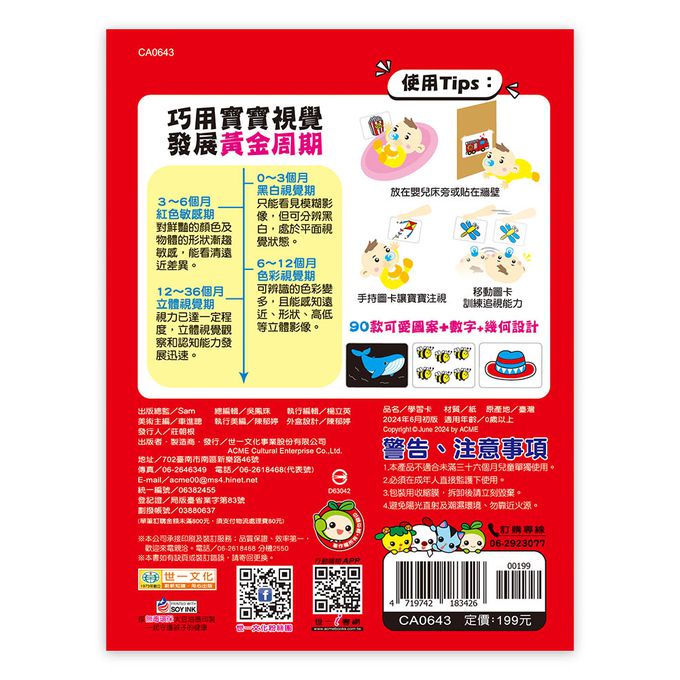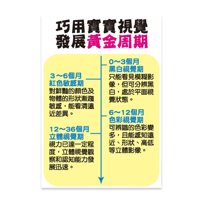 0到3歲,是幼兒大腦發育的黃金時期.眼睛,是寶寶接收外界資訊最有效的管道.寶寶接受的視覺刺激越多,頭腦的各項發展就會越精密.在3到6個月時,寶寶對鮮豔 的顏色及物體的形狀漸趨敏感,能看清遠近差異.原色卡可以幫助寶寶視覺發展的需求,刺激腦部視覺神經,是促進訓練寶寶視覺發展的最佳工具.