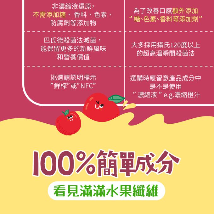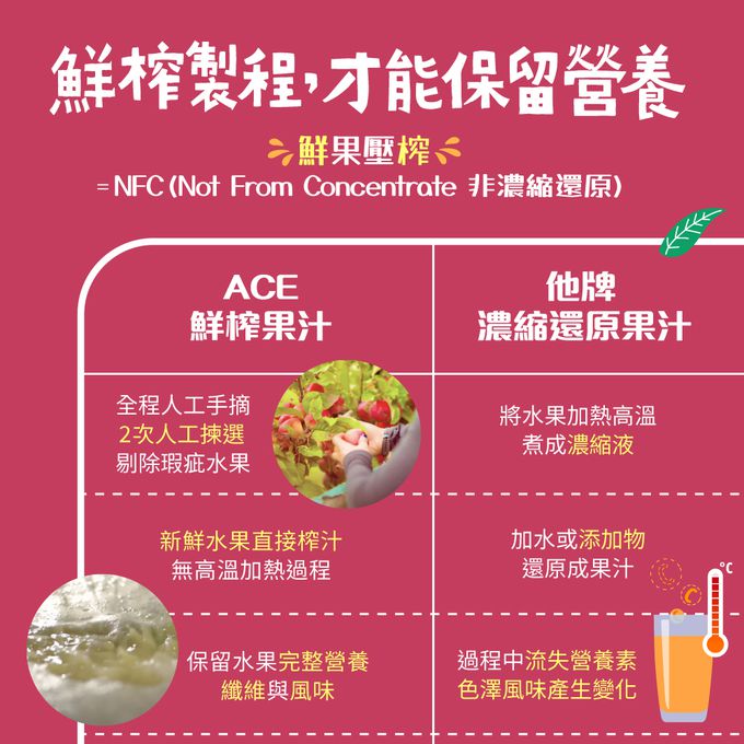 • NFC鮮榨果汁,非濃縮還原保留營養