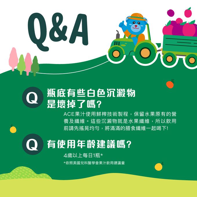 • 注意事項:1.瓶內沉澱物為水果纖維,飲用前請先搖晃均勻。 2.兒童請由家長陪同下食用。 3.本品含有維生素C,因維生素C的建議攝取量上限限制,每天食用不要超過420ml。 4.請存放陰涼乾燥處避免日光直射。開封後冷藏保存,並於三天內食用完畢。