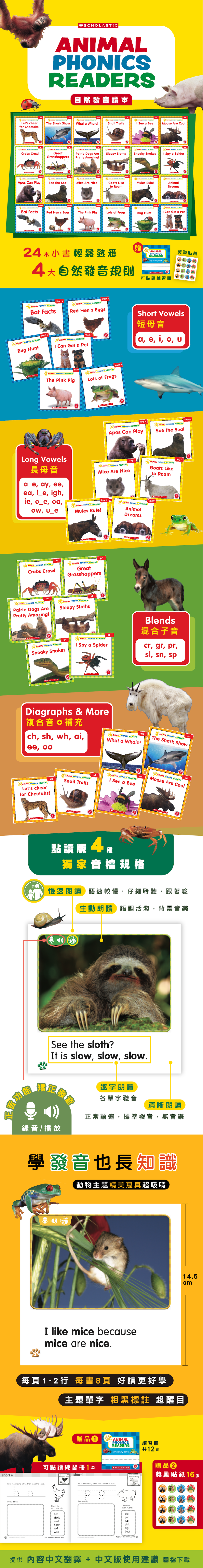 除了動物寫真超吸睛,每頁1~2行的句子,每書8頁,好讀更好學~學發音之餘還能長知識,了解動物習性!